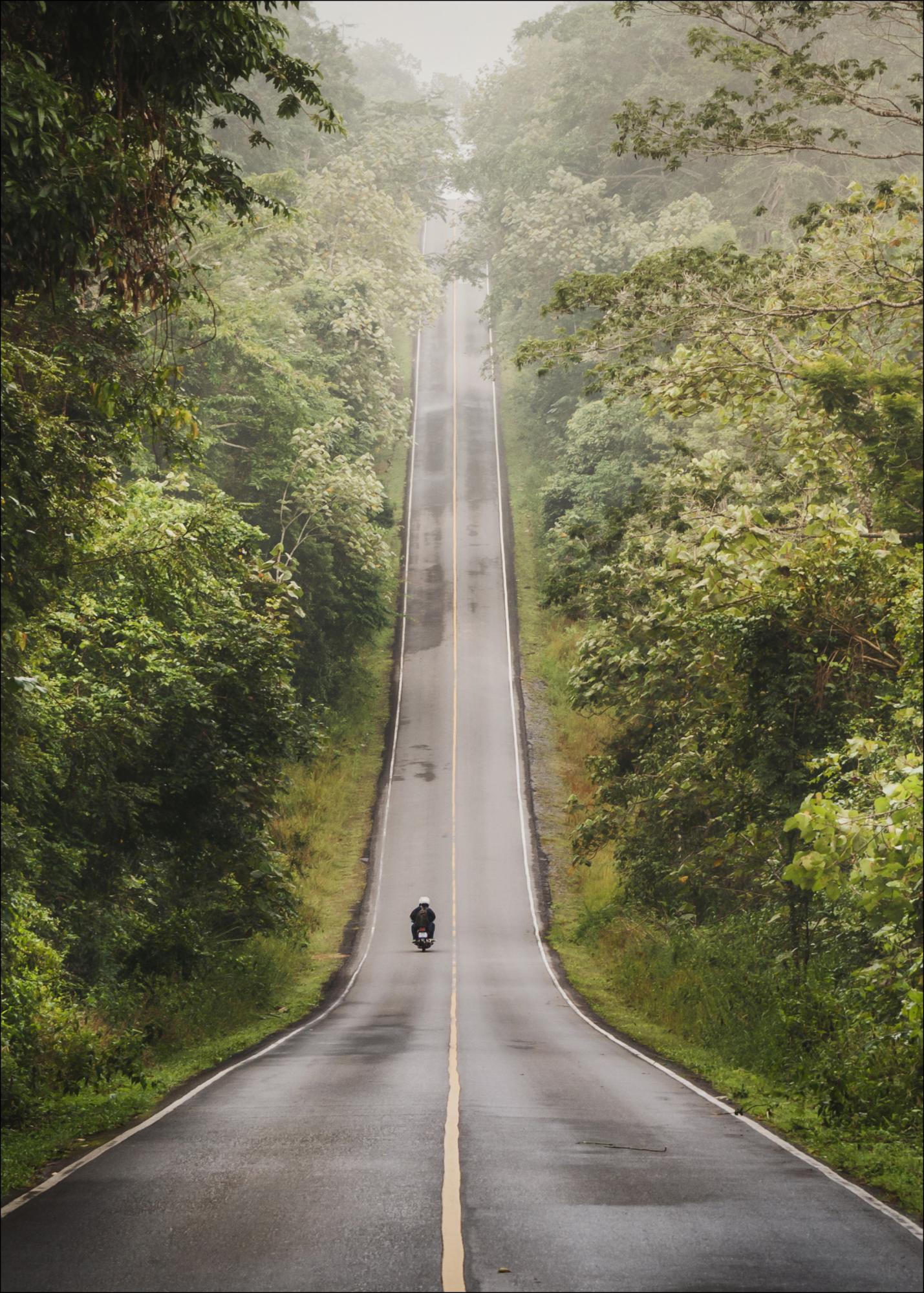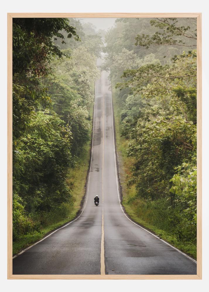 Tiha naravna fotografija ceste z osamljenim motoristom, ki reže skozi čudovito bujno zelenje. Miren in pomirjujoč poster, ki se odlično poda skupaj z drugimi priljubljenimi na večji steni s slikami.