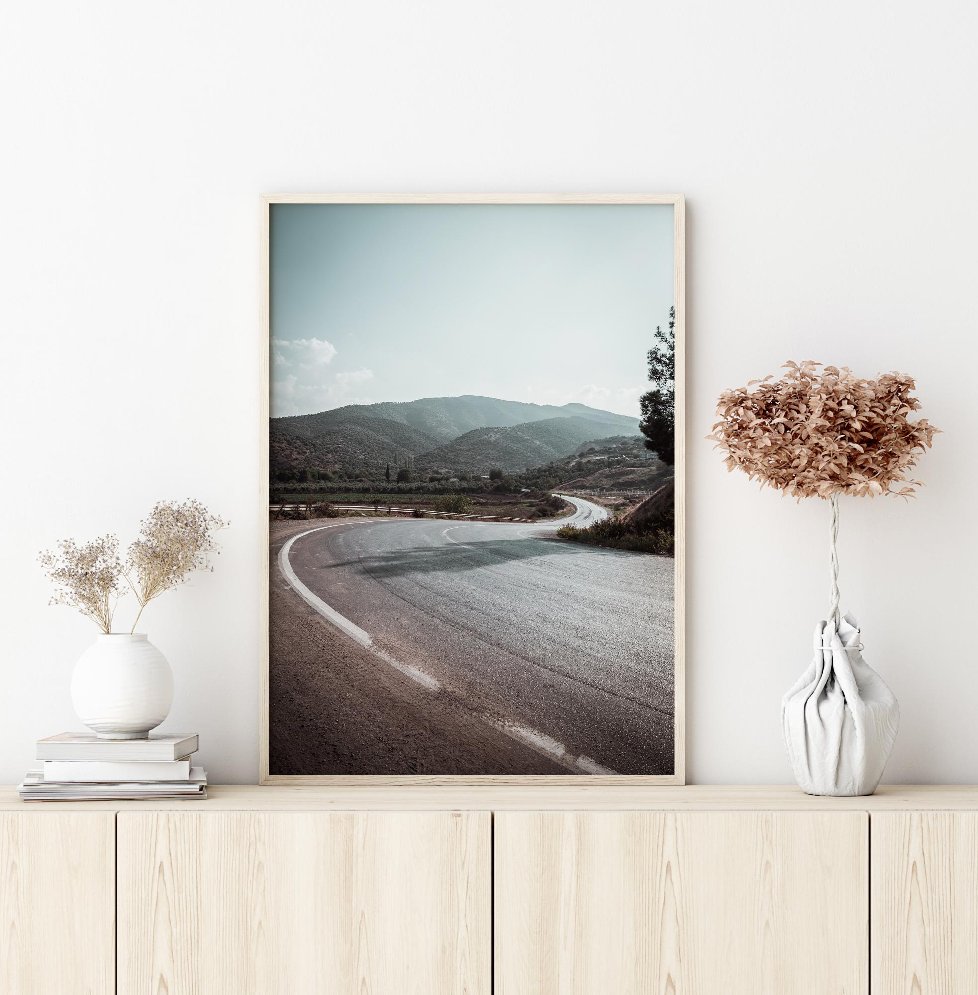 Prizor z naravno lepim plakatom z vijugasto cesto med gorami. Osamljena asfaltna cesta se vije v daljavo proti oddaljenim gorskim vrhovom. Barve so mehke in spominjajo na pomladni dan, ko se peljete z odprto streho. Ujemite tisti lahkotni zračni občutek s tem plakatom.