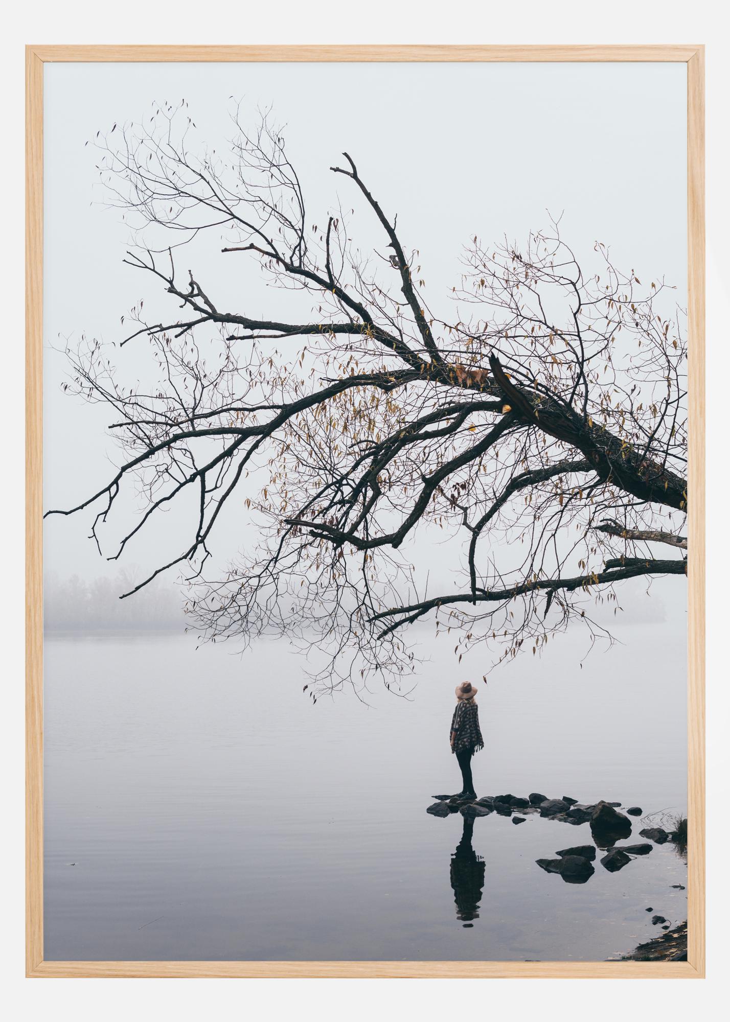 Poster s pogledom na jezero ženske, ki stoji na majhnem kamnitem pomolu v jezeru, medtem ko se drevo sklanja nad njo. Belo jezero se ujema z nebom iste barve. Ženska izstopa v kontrastu, ko zre čez vodo v mirni kontemplaciji. Prinesite mir v svoj dom s to podobo narave.