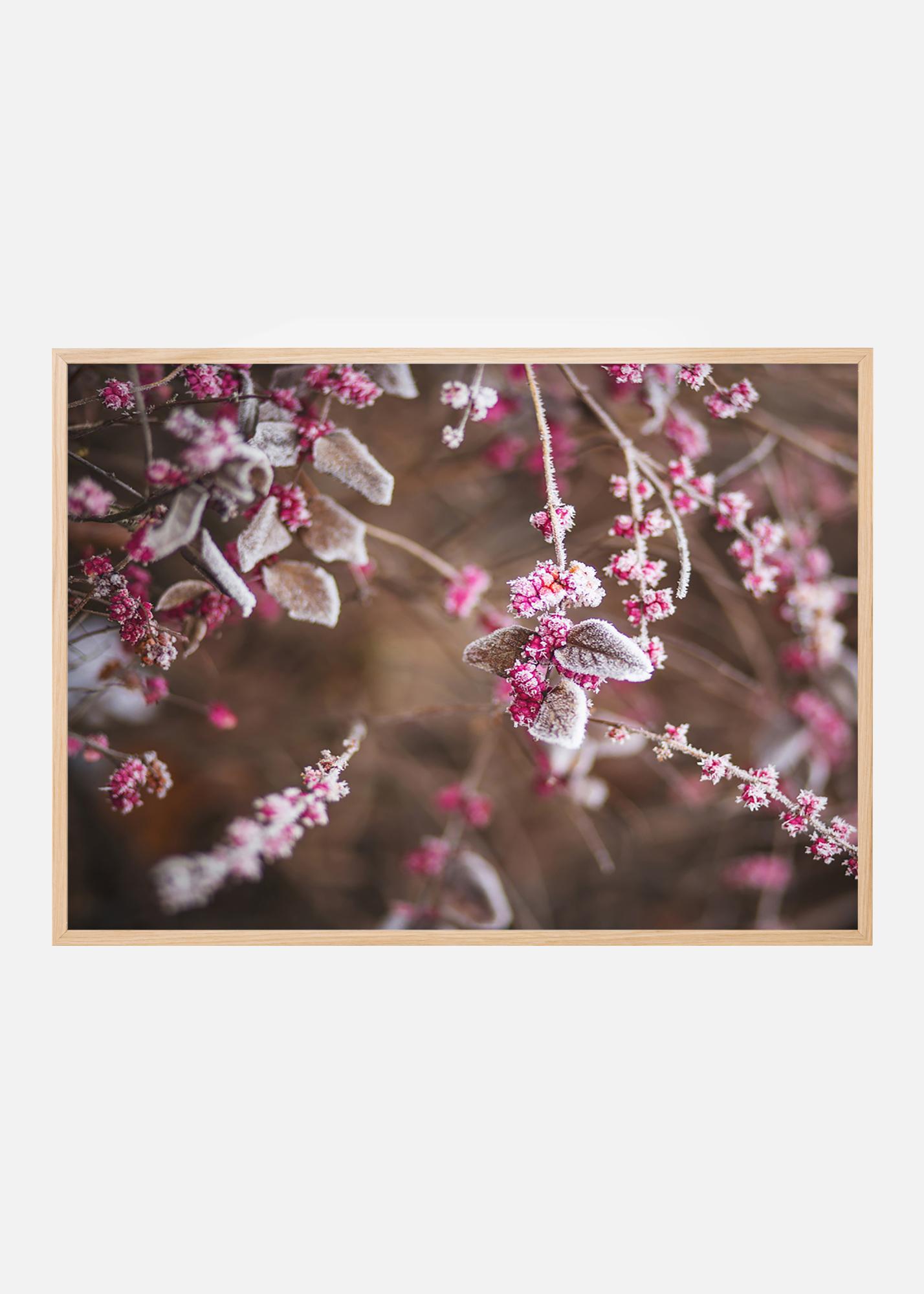 Fotoumetnost s posnetkom od blizu zmrznjenih rožnatih jagod z majhno globinsko ostrino. Tisk z jagodami v roza barvi in ozadjem v čokoladnih tonih daje topel in prijeten občutek. V večji velikosti s čudovitim okvirom postane slika osrednja točka v dnevni sobi ali postavite manjšo različico v kolaž z drugimi plakati v enakih barvnih odtenkih.