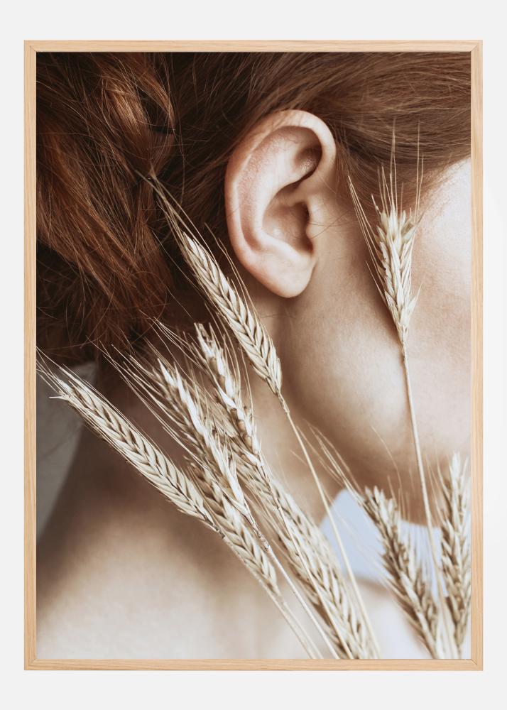 Portret ženske z nekaj pšeničnimi klasji. Njeni rdeči lasje in svetla polt prebudijo občutek, da je gozdna boginja. Ta plakat je popoln, ko imate doma žetveni praznik.