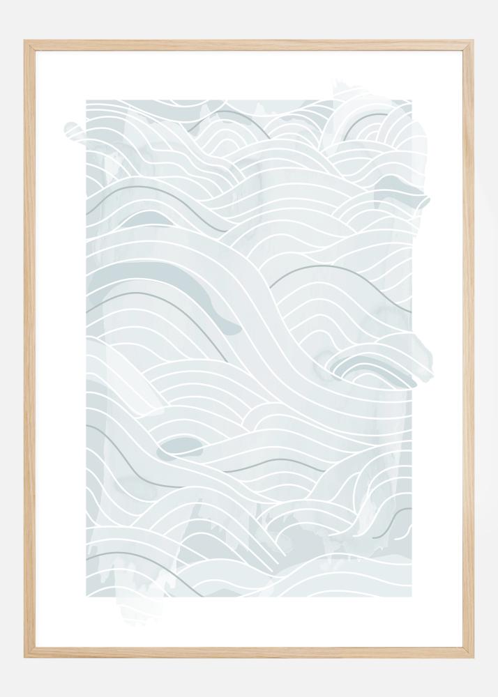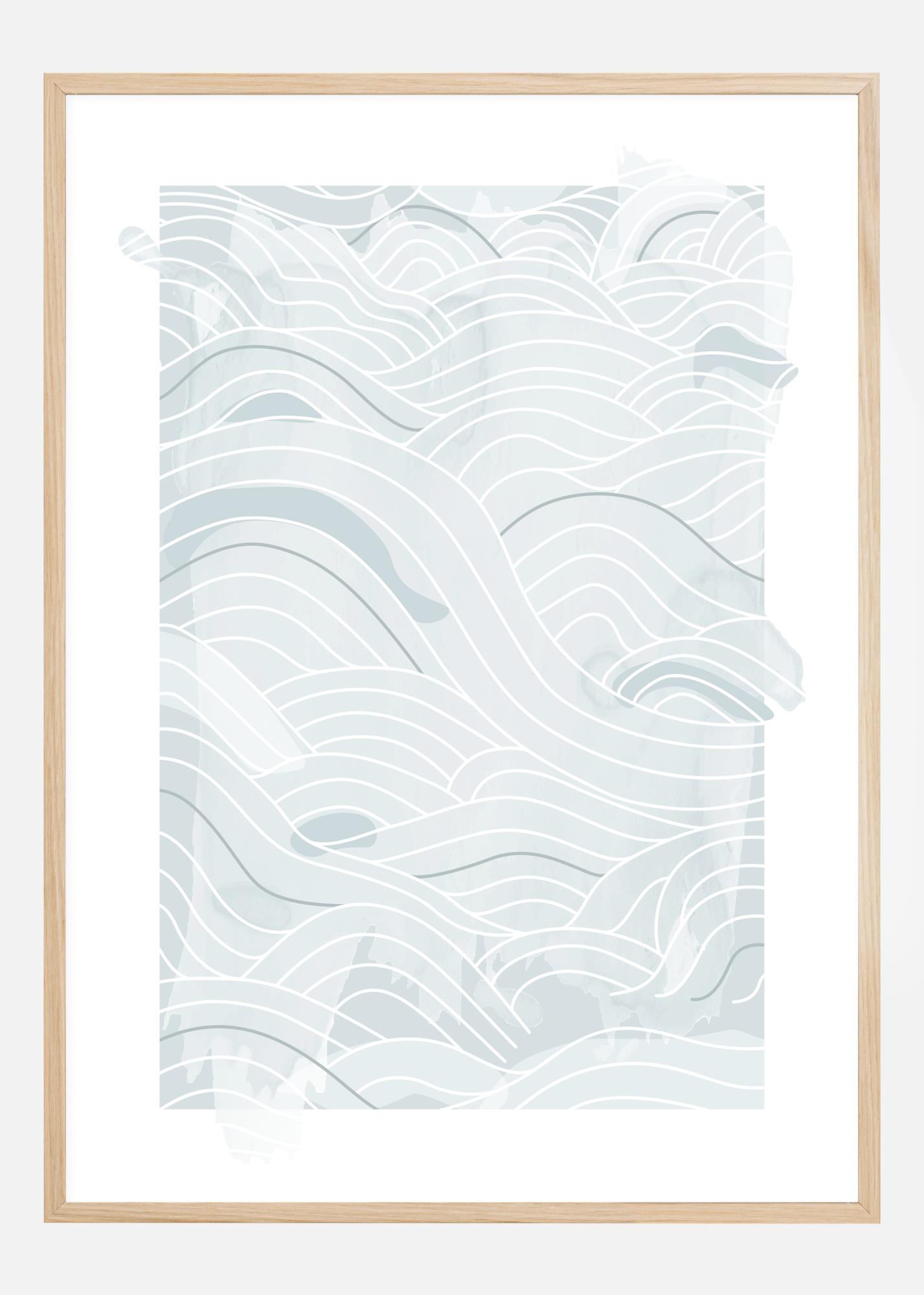 Morski poster z mehko modrimi abstraktnimi linijami in valovi na beli podlagi. Različni odtenki modre in različne debeline črt so kombinirani za ustvarjanje teh valovitih valov po strani. Naj misli tavajo in se prepustite, da vas odnese ta mehak morski vzorec.