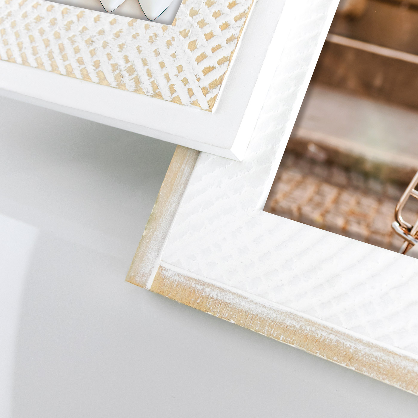Podeželski kolažni okvir v beli in leseni barvi, ki elegantno obdaja več vaših motivov in hkrati postane lep detajl v vašem domu. Ta lep kolažni okvir ima prostor za 4 slike velikosti 10x10 cm / 10x15 cm / 13x18 cm. Kolažni okvir je izdelan iz lesa in zunanje mere so 38,8x39,8 cm. Stenski nosilec je priložen.