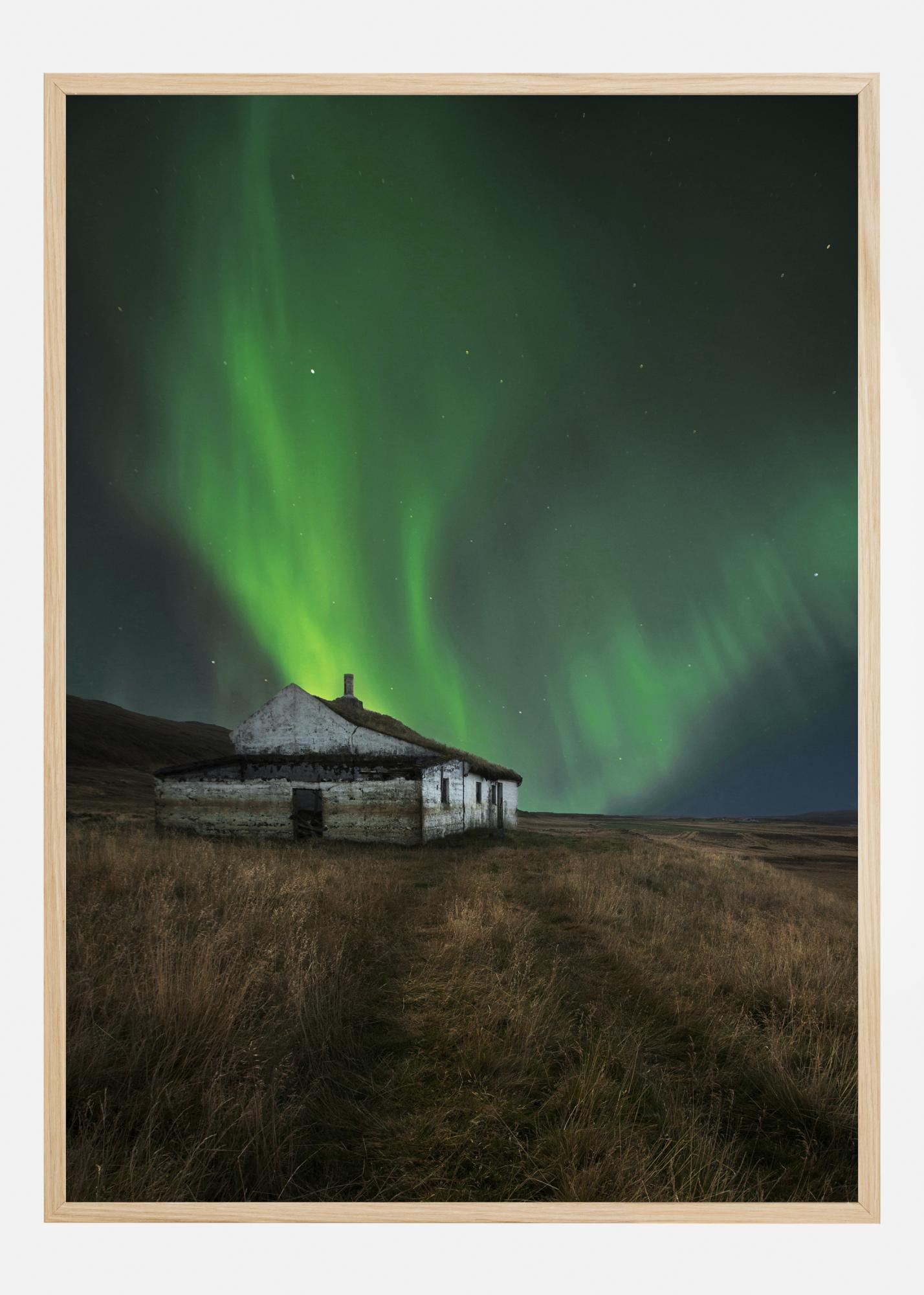 Čudovit plakat s svetlo zelenim in rumenim severnim sijem nad majhno belo hišo. Jasne barve severnega sija se zdijo, da se premikajo in utripajo, ko strmite v ta fascinanten prizor. Sprejmite veličastnost narave in vnesite ta naravni pojav v svoj dom za eterično lepoto.