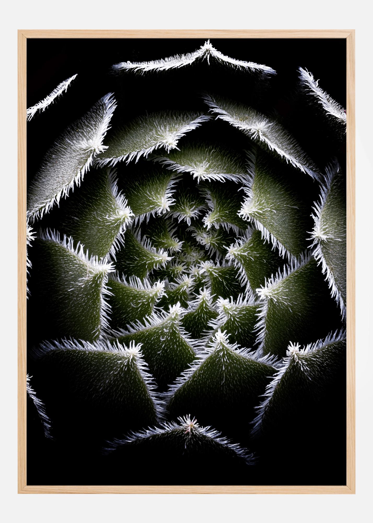 Makro fotografija rožice sempervivum. Bližnji posnetek te rastline prikazuje rožico globoko zelenih listov, pri čemer ima vsak od njih majhne bele bodice. Podrobnosti so neverjetne in vsak bo postanek pri tem osupljivem plakatu.