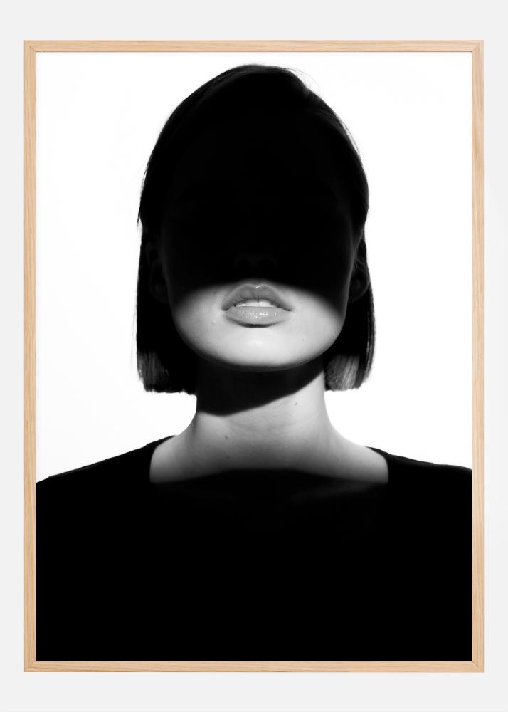 Ta osupljiva plakat zajame močno podobo ženske, katere oči so skrite v temni senci, kar ustvarja skrivnosten in miselno spodbuden učinek. Ostra kontrast med belimi poudarki in globokimi črnimi toni poudarja njene izrazite ustnice in kiparske obrazne poteze. Je podoba, ki balansira na meji med vidljivostjo in anonimnostjo, svetlobo in temo, ter privablja opazovalca, da išče globlje pomene.