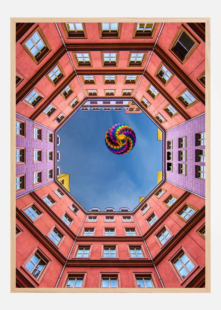 Živahen plakat v perspektivi žabe skozi rožnate stavbe proti jasno modremu nebu. Stavbe tvorijo heksagon, ko pogledate navzgor mimo vseh oken. Sredi modrega neba je balon v mavričnih barvah, ki lebdi nad odprtino. Naj vas ta svetla, optimistična slika popelje v domišljijo.