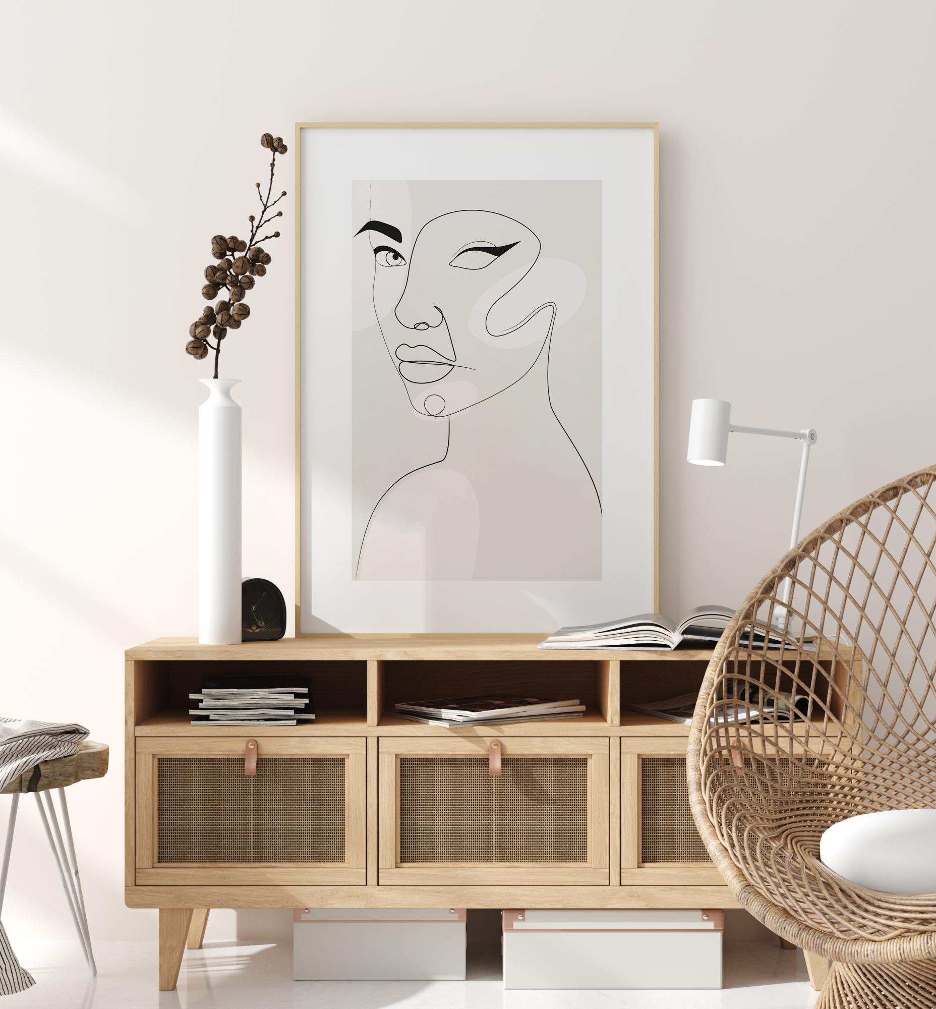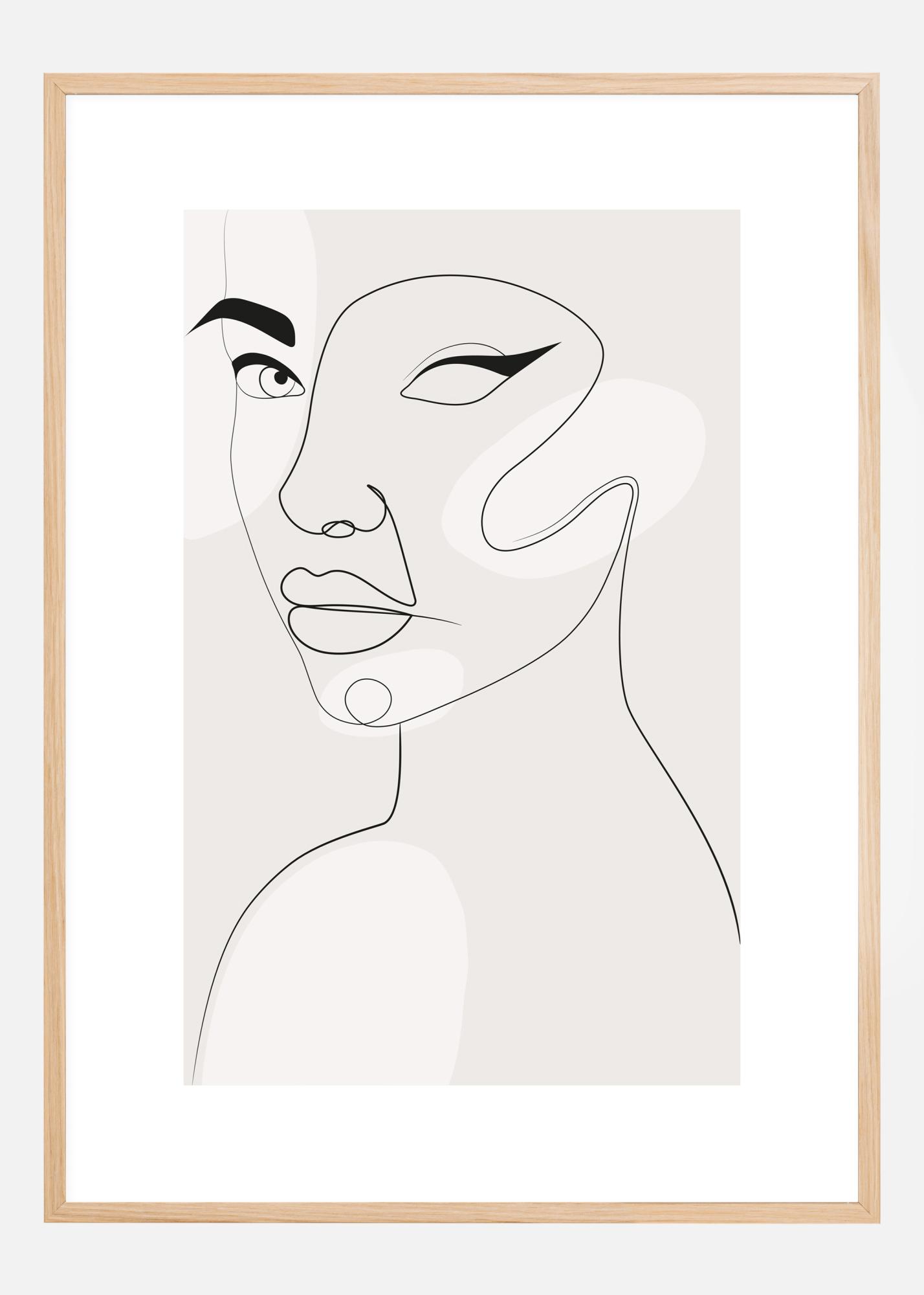Modernistični poster z abstraktnim ženskim obrazom. Tanke linije se vrtijo po strani in ustvarjajo njen obraz. Eno oko strmi vate z močnimi detajli. Drugo je nepopolno, a ima čudovit eyeliner. Ima vzvišen izraz, ko te gleda v tem elegantnem minimalističnem delu.