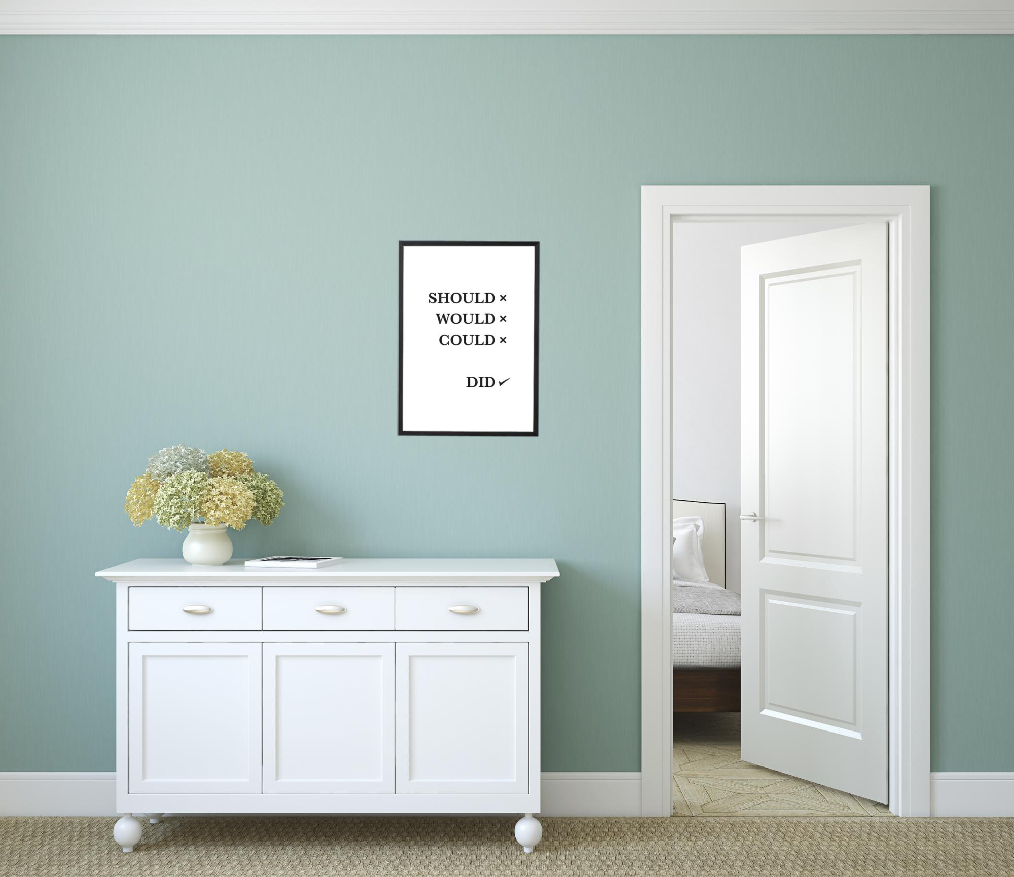 Zakaj bi zapletali vse briljantne ideje, ki jih dobite, z omejujočimi mislimi? Samo storite to! S tem plakatom na steni ni več izgovorov. Plakat je bel s črnim potiskom, ki vsebuje seznam z besedilom "Should Would Could", kjer je poleg vsake besede križec. Na dnu je beseda "Did" s kljukico poleg. Črno-bela zasnova izgleda odlično z barvitim okvirjem. Ker je plakat na voljo v več različnih velikostih, boste našli enega tako za pisalno mizo kot za steno.