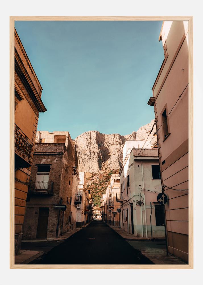 Ta očarljiv plakat ujame bistvo slikovite ulice v sicilijanski vasi Cinisi, z njenimi toplimi zemeljskimi barvami in ozadjem veličastnega gorovja, ki se dviga proti jasnemu modremu nebu. Bledo roza in rumeni odtenki stavb so v lepem kontrastu z surovim gorskim terenom v ozadju in dajejo občutek miru in tišine. Ta tisk je poklon sicilijanskemu rustikalnemu šarmu in njegovi sposobnosti združevanja narave in kulture v harmonično celoto.