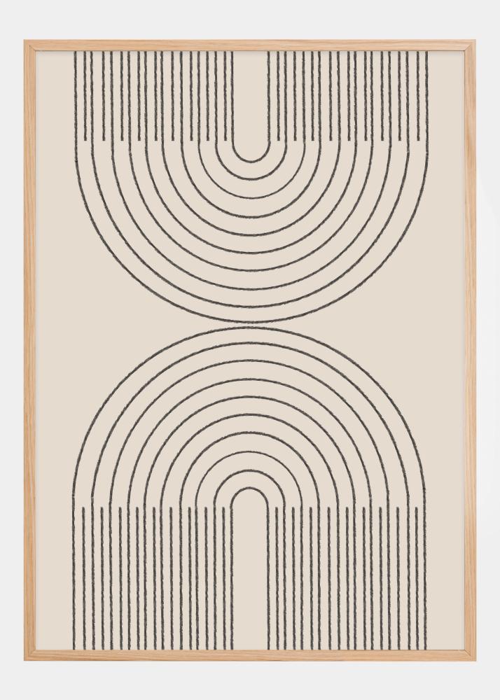Ta minimalistični plakat zajame esenco preprostosti s svojo poenostavljeno arhitekturno zasnovo. Elegantni loki, risani s preciznostjo, ustvarjajo občutek miru in strukture, medtem ko črna na beli podlagi daje jasno vizualno kontrast, ki je hkrati drzno in preprosto. Ta umetniška predstavitev je tako moderna kot brezčasna, primerna za različne notranje stile.