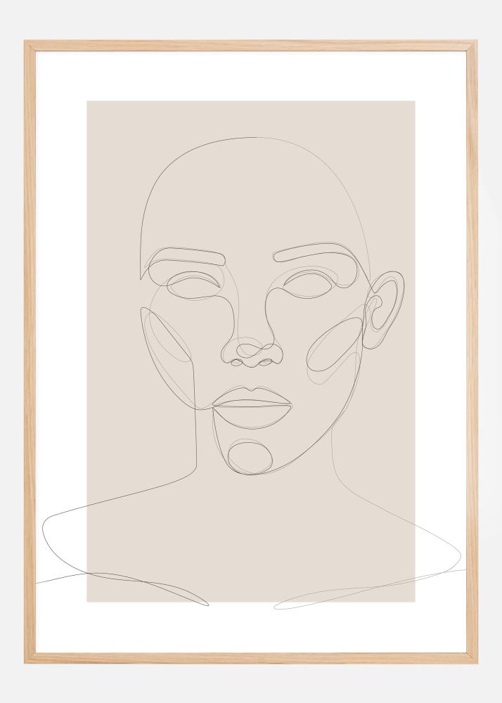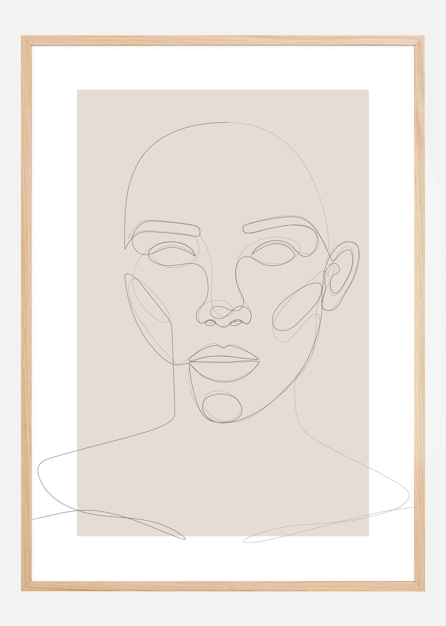 Preprosta abstraktna plakat z obrazom, ustvarjenim s pomočjo tankih linij. Obraz zre naravnost in je ustvarjen s pomočjo ene same dolge tekoče črte, ki na fascinanten način vključuje vse glavne poteze obraza. Ta slika je narejena z uporabo sivega ozadja in se najbolje poda na nevtralno steno.