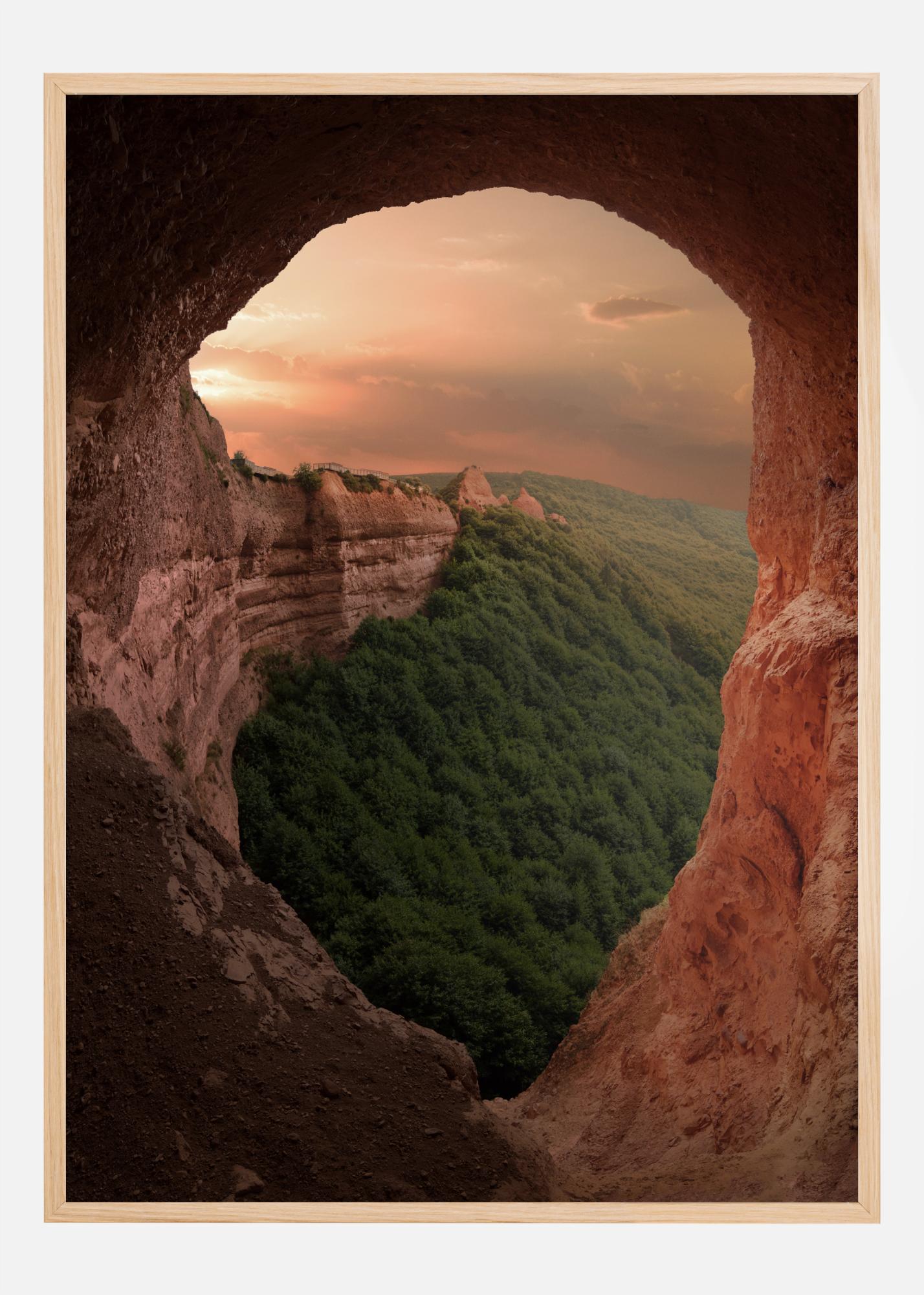 Impresiven plakat z dramatično rdečo pokrajino. Poglejte skozi odprtino v skali, da vidite rdeče skale, ki se raztezajo v daljavo. Rastoča zelena drevesa tvorijo popoln kontrast, ko sonce zahaja in vrže toplo svetlobo na vse. Obiščite ta kraj od doma.
