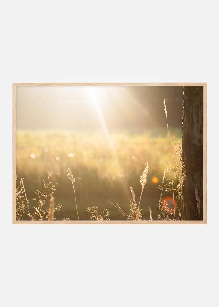 Plakat z sepija obarvano fotografijo proti svetlobi na poznopoletni travnik z žarečimi travnimi bilkami v ospredju. Motiv je miren in skoraj slišimo zvok kobilic v toplem poletnem večeru. Poster se lepo prilega v vse vrste notranjih stilov s svojo umirjeno barvno lestvico in je lep za obešanje skupaj z drugimi naravnimi motivi.