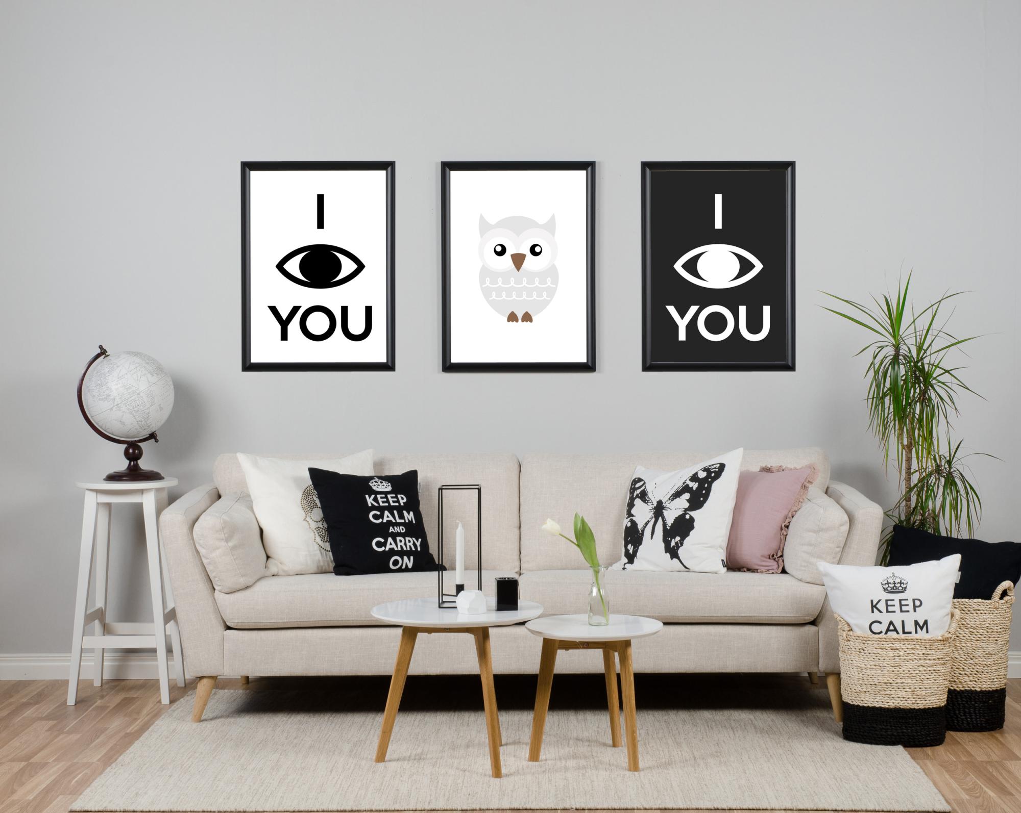 Sladka plakat s ptičem številka ena, sovico. Ilustracija stilizirane dimno sive sovice na beli podlagi je postala moderna klasika. Motiv se enako dobro poda v dnevno sobo kot v otroško sobo in se še posebej dobro ujema z notranjo opremo, ki pobere barvo na sliki. Kombinirajte z drugimi pticami ali živalmi za divji občutek.