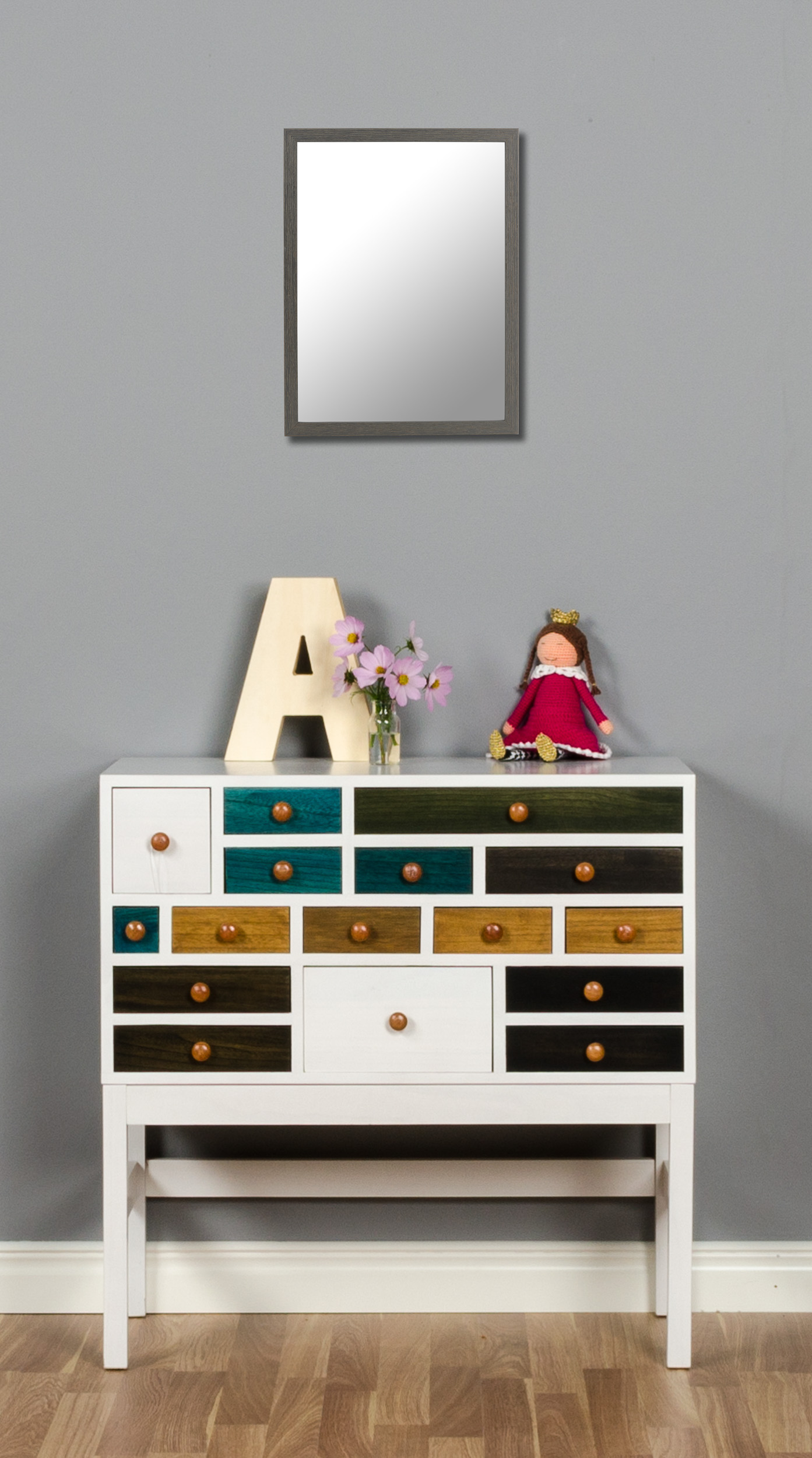 Prava ogledala popestrijo vašo steno in hkrati postanejo lep dodatek v notranjosti. To stilsko ogledalo ima sivo barvo, ki je popolna v kombinaciji z ozadji, tekstili in drugimi notranjimi komponentami v črni, beli in drugih sivih odtenkih. Ker je barva polprozorna, prehaja struktura lesenega okvirja in daje naraven vtis. Ker je ogledalo izdelano po vaših lastnih merilih, ga dobite v formatu, ki vam in vašemu domu najbolje ustreza!