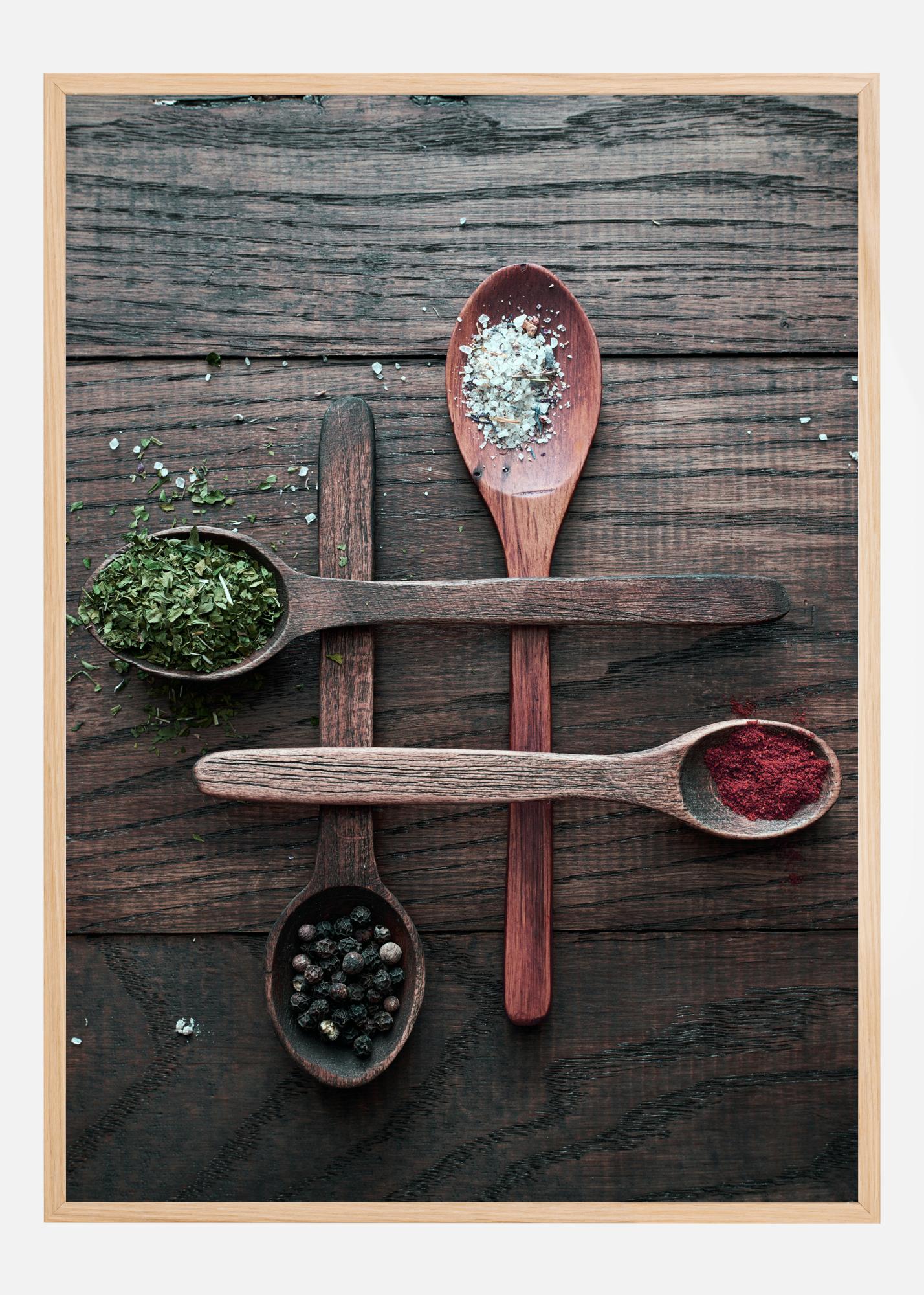 Plakat s tihožitjem s štirimi lesenimi žlicami, ki vsaka vsebuje začimbo. Štiri žlice se križajo med seboj in tvorijo mrežo na rustikalni leseni mizi. Zelišča in začimbe se razsipajo iz vsake žlice in ustvarjajo zabavno kuharsko atmosfero, popolno za vašo kuhinjsko inspiracijo.
