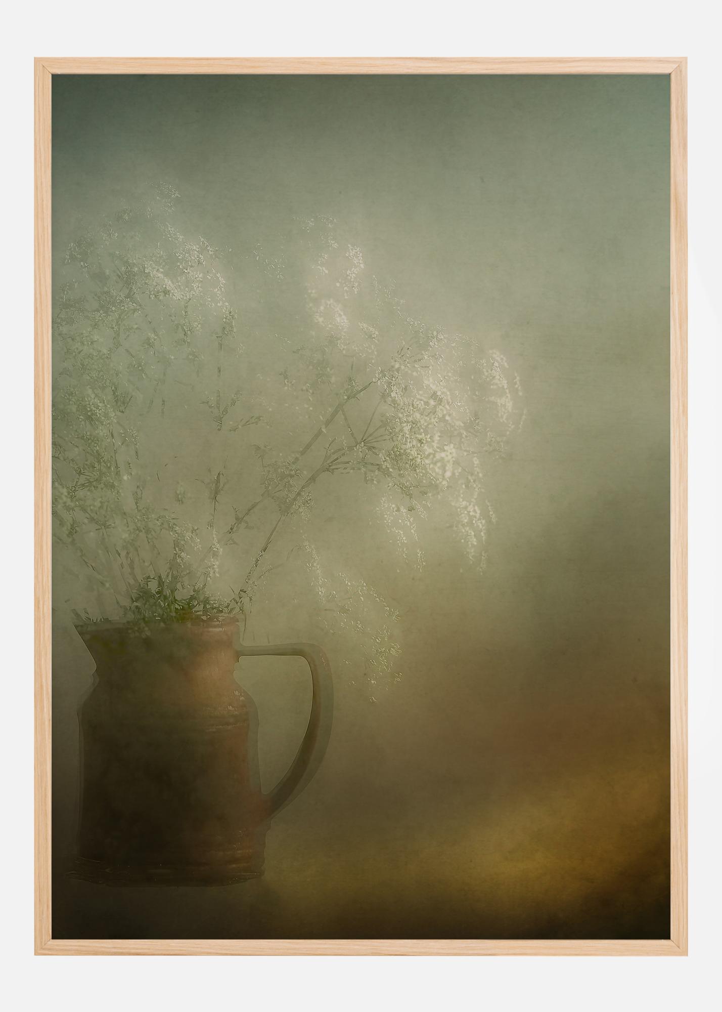 Poslikana tihožitna slika z rjavim lončenim vrčem, polnim mehkih tekočih belih cvetov. Ta pomladni šopek je oblačen po naravi in skoraj izgine proti mehki sivi steni zadaj. Oranžni sij daje toplino pri dnu slike, kjer vrč stoji.