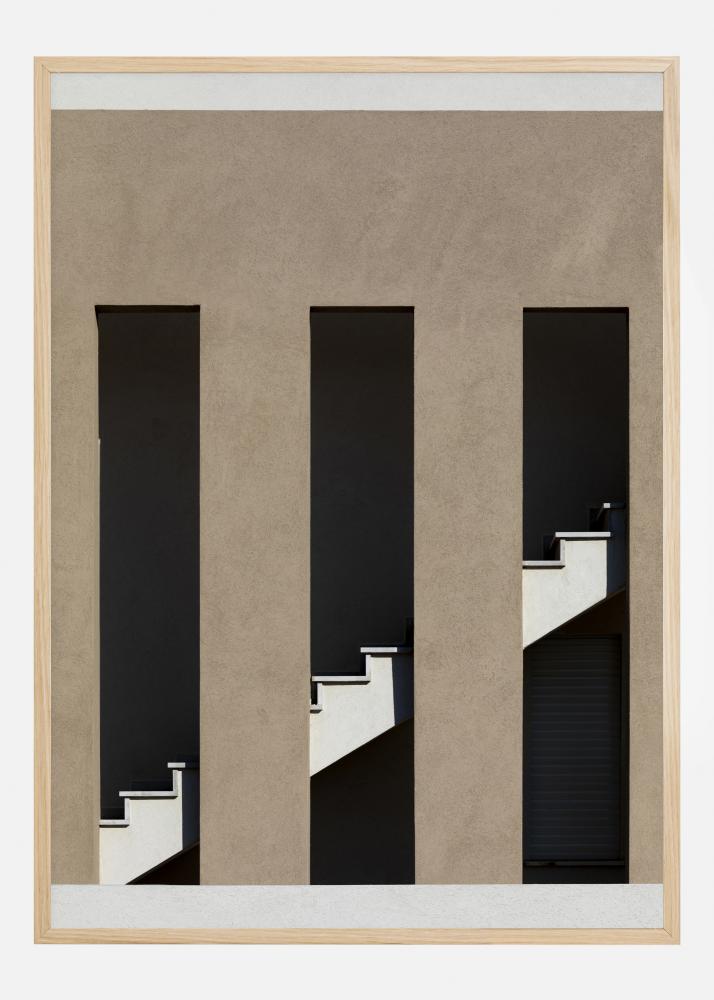 Plakat v mestnem okolju s stopnicami, ki se dvigajo za velikimi okenskimi odprtinami. Fantastična abstraktna podoba, kjer geometrične oblike ustvarjajo občutek reda v tej dramatični sliki. Ta slika daje vašemu domu pridih umetnosti.