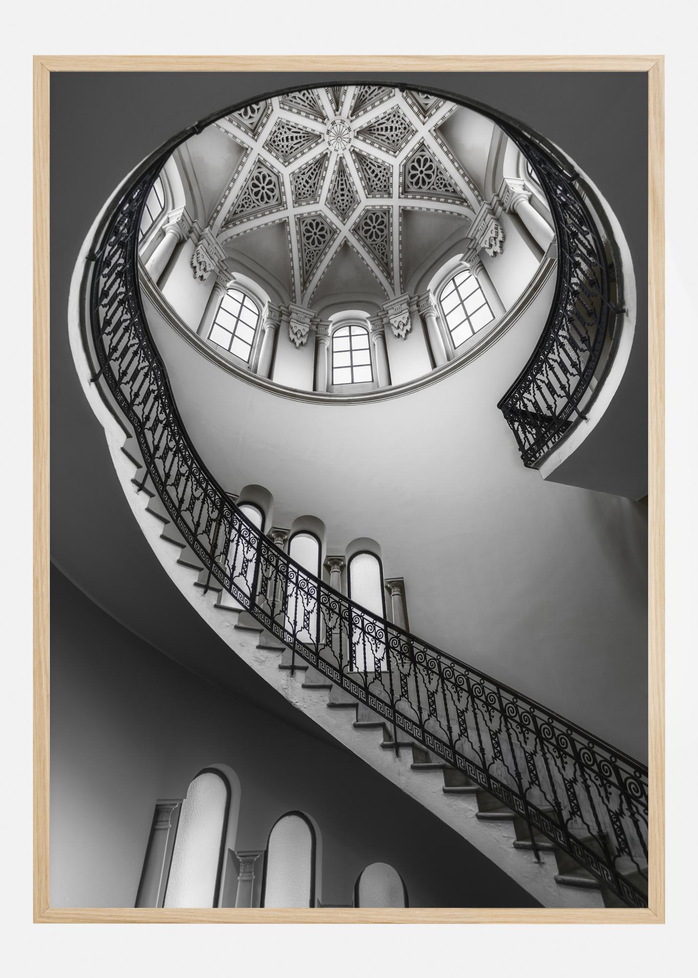 Zapleten plakat z notranjostjo stavbe. Spiralno stopnišče z zapletenimi kovanimi železnimi palicami se vije proti stropu. Pogled je usmerjen proti kupoli s fantastičnim dizajnom rešetk in svetlimi okni, skozi katera prodira svetloba. Eleganca in bogastvo podrobnosti se združujeta v tej črno-beli sliki.