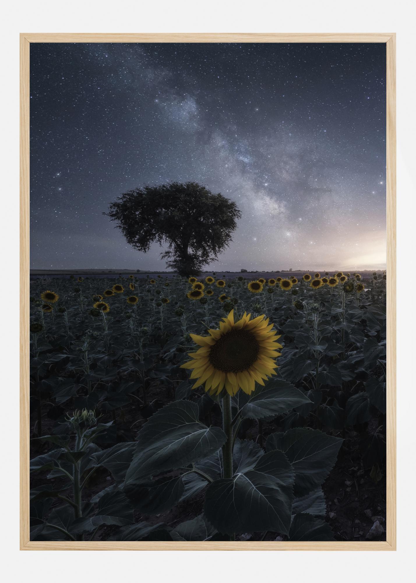 Rožnat plakat s sončnicami ponoči. Polje sončnic drži svetlo rumene cvetove proti nočnemu nebu. To se odraža v sončnem zahodu v daljavi, ki še vedno osvetljuje cvetove, a hkrati osvetljuje nebo, tako da se vidijo zvezde. Mistika je v obilju v tem pogledu.