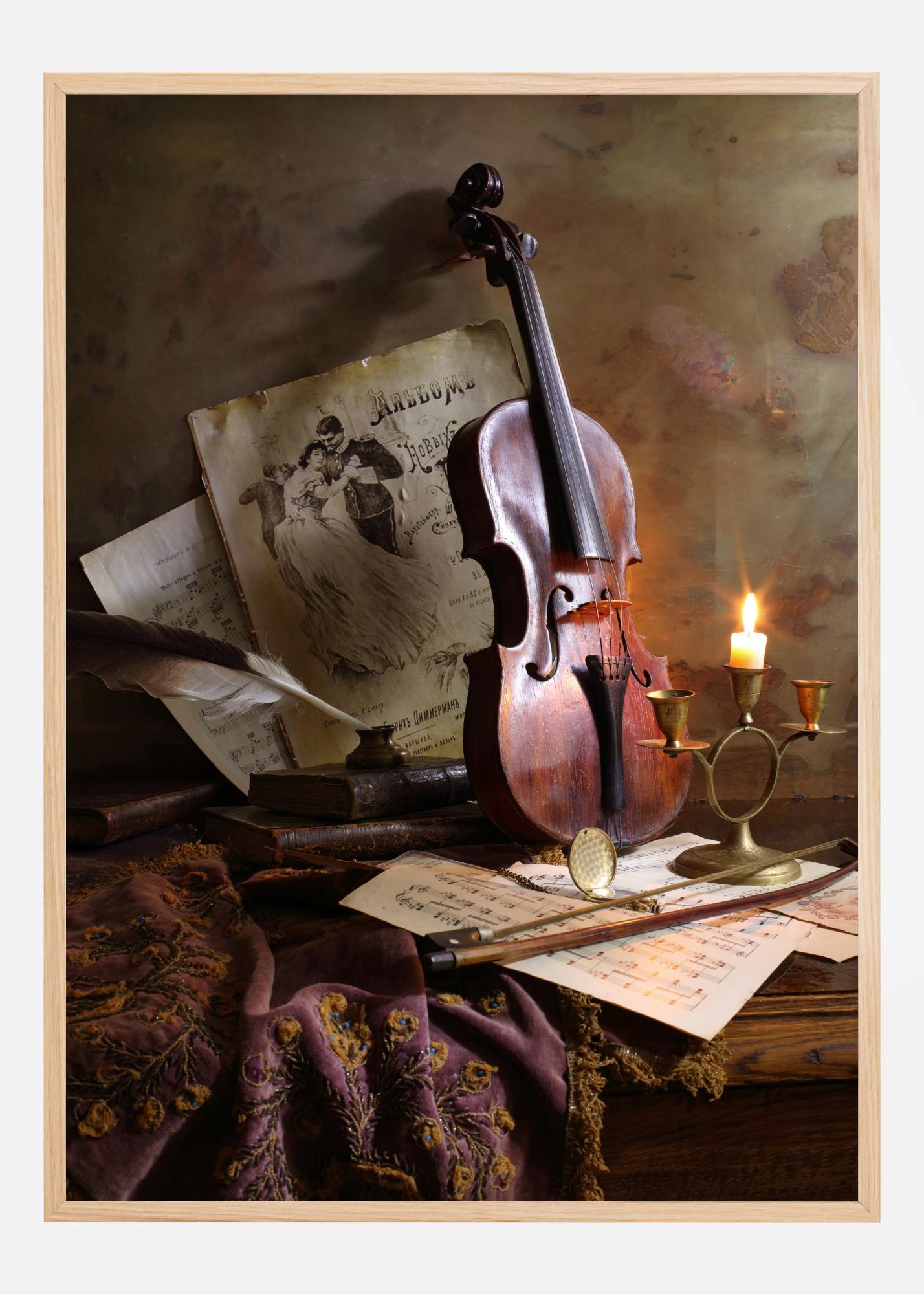 Plakat z motivom tihožitja z violino in notnimi listi. Mehka svetloba močno gori in osvetljuje mahagonijevo barvo violine, ko stoji ob zidu. Platno, notni listi, pero, lok in drugi dodatki zapolnjujejo prizor in dajejo prostoru topel in izpolnjujoč občutek.