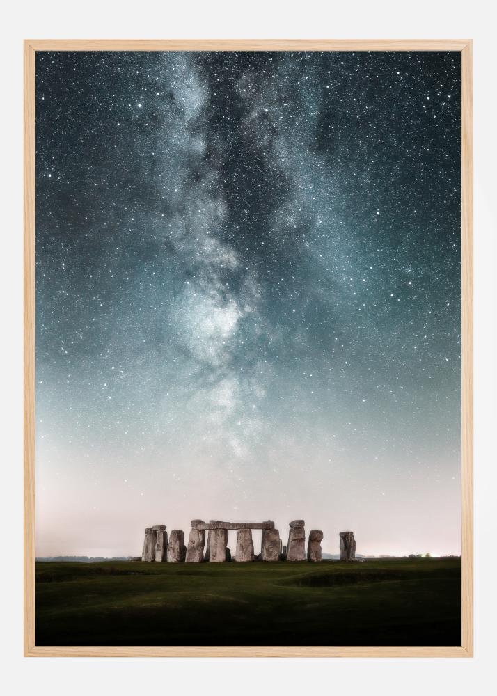 Znameniti plakat s Stonehengeom proti dramatičnemu z zvezdami posutemu nočnemu nebu. Ta široka slika se osredotoča na dramatično Rimsko cesto, ki se vije skozi modro nebo, polno zvezd. Sledite galaksiji navzdol, dokler ne vidite Stonehengea kot majhno kamnito formacijo na dnu slike in dobili boste drugačen pogled na to impresivno svetovno čudo.