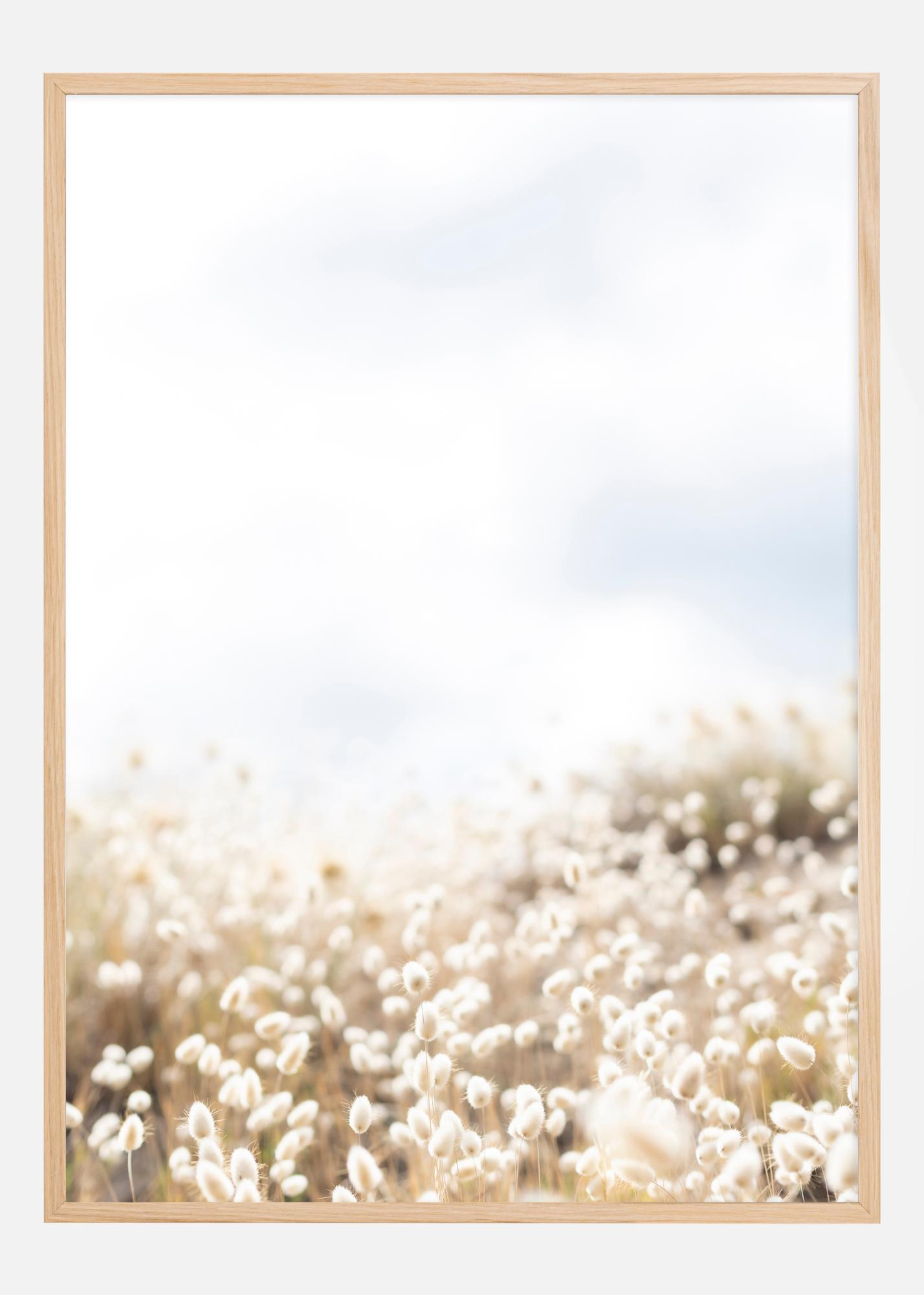 Ta sanjska plakat zajema polje, polno lahkih, puhastih cvetlic, ki se kopajo v mehki sončni svetlobi. Motiv, napolnjen z naravo in spokojnostjo, prenaša občutek topline in miru. Nežna glava belih cvetlic prikimava v tihi sapici, in slika je ovita v pastelne tone rumene, bež in bele, ki se zlijejo z jasno modrim nebom.