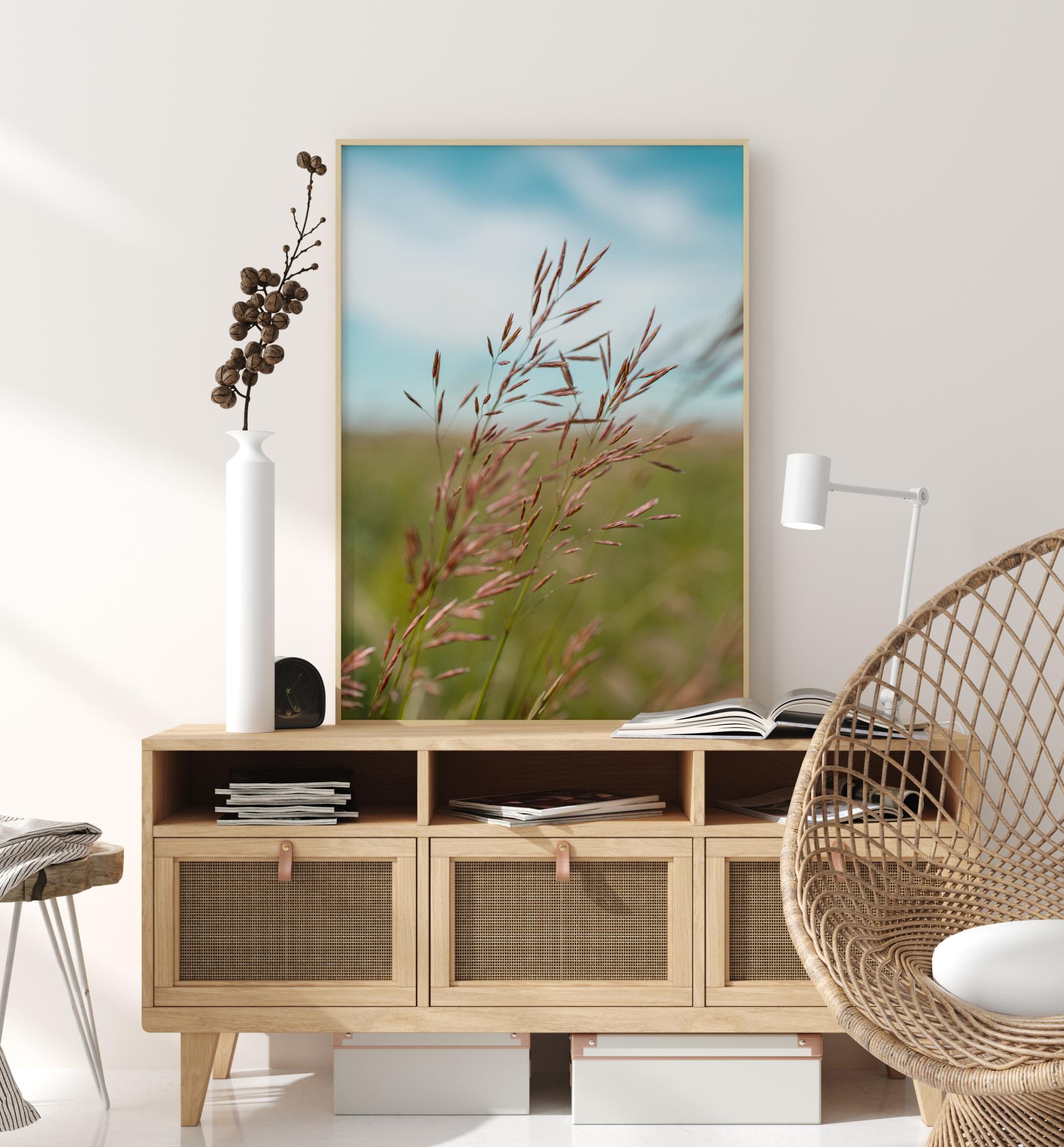 Plakat z osvetlitvijo vsebuje zeleno polje z bližnjim posnetkom travnih semen na dolgem steblu. Mehko rožnato-rdeče travno seme se izstopa na svetlo zelenem polju v ozadju. Modro nebo z mehkimi belimi oblaki ustvarja popolno poletno vzdušje. Ta vesela scena bo razsvetlila vsak prostor.