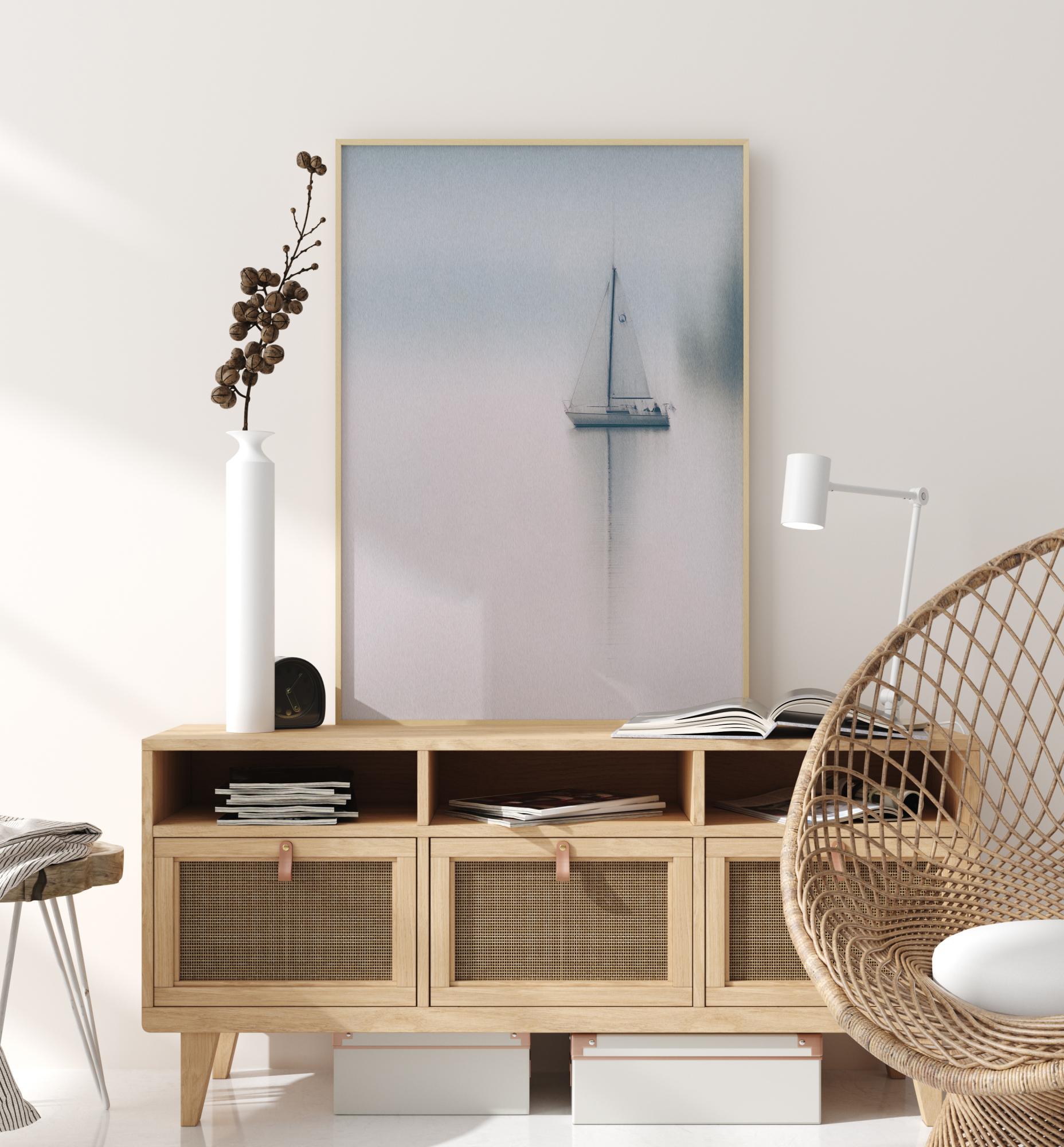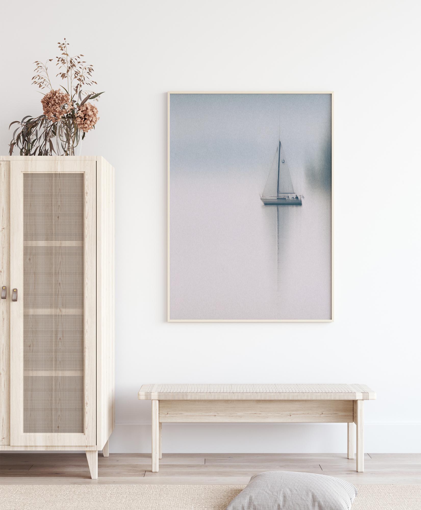 Pomirjujoči plakat jahte sredi belega jezera. Slika je mehka z zamegljenimi robovi vseh figur. Jadro čolna je raztegnjeno na vodi, ko drsi skozi svetlo modro in sivo meglo zgodnjega nedeljskega jutra.