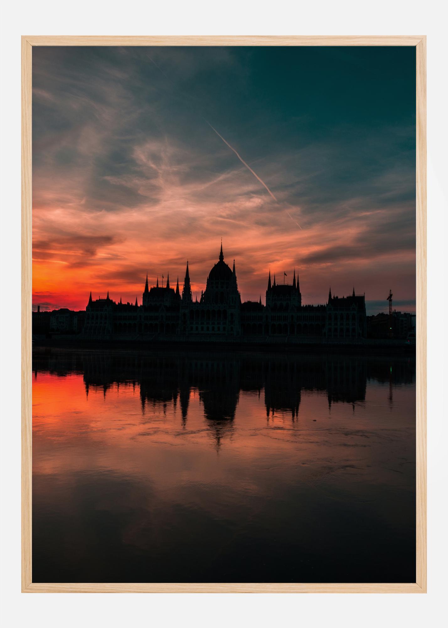 Plakat sončnega zahoda z mestom, ki ima pogled na veliko vodno površino. Močna črna silhueta mestnih stolpov se odseva v vodi. V ozadju osupljiv rdeč sončni zahod osvetljuje nebo in meče dramatično svetlobo preko vode in mesta.