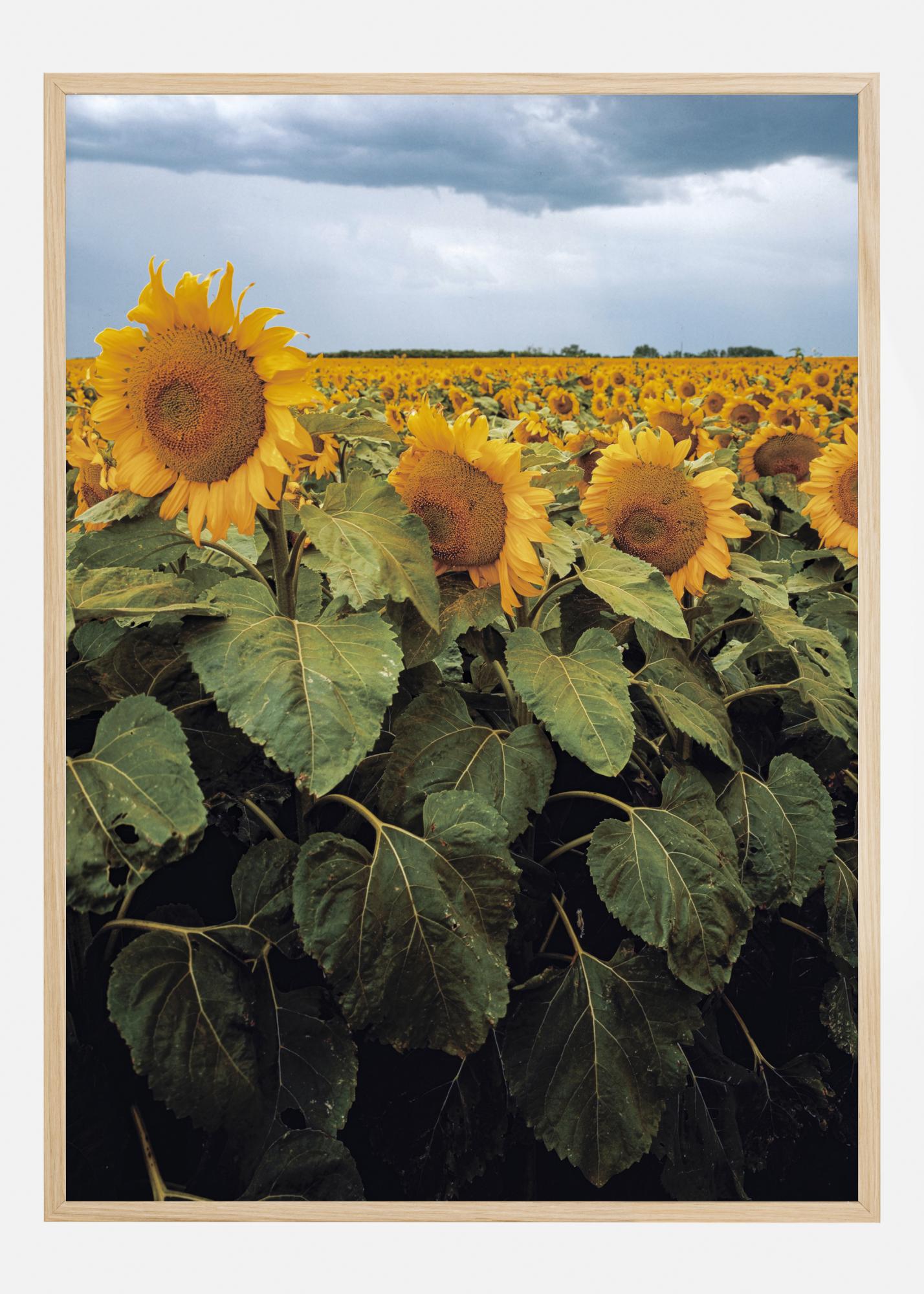 Osupljiv plakat z velikim poljem sončnic. Slika je napolnjena z dolgimi zelenimi stebli in listi cvetov. Na vrhu lebdi morje svetlo rumenih sončnic, ki segajo proti daljavi in modremu nebu. Počutite se vzneseno s tem veseljem odtisom.