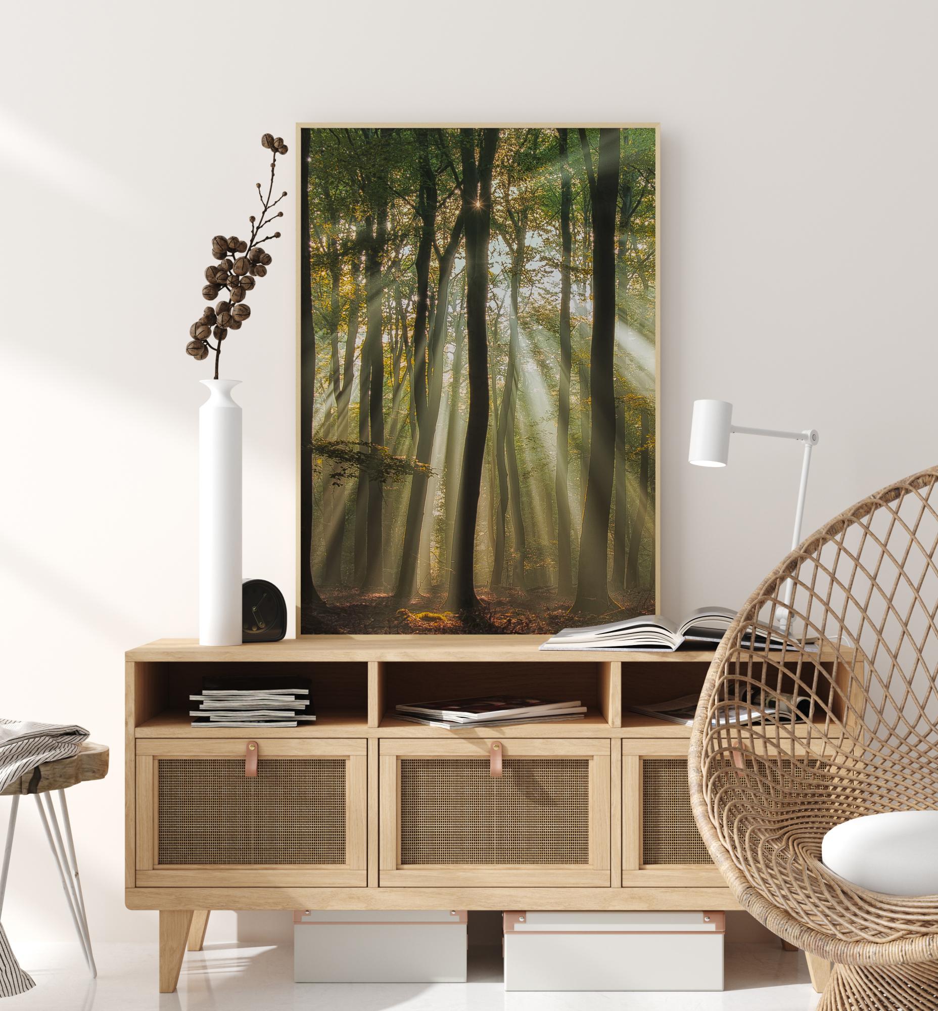 Plakat gozda s sončnimi žarki, ki padajo med visokimi drevesnimi debli. Dolga debla usmerjajo pogled navzgor skozi sliko. Kot zvezda sije sonce na vrhu skozi odprtino in meče mehke žarke skozi drevesa ter osvetljuje gozd v mehki zeleni svetlobi. Predstavljajte si sprehod po tihem gozdu.