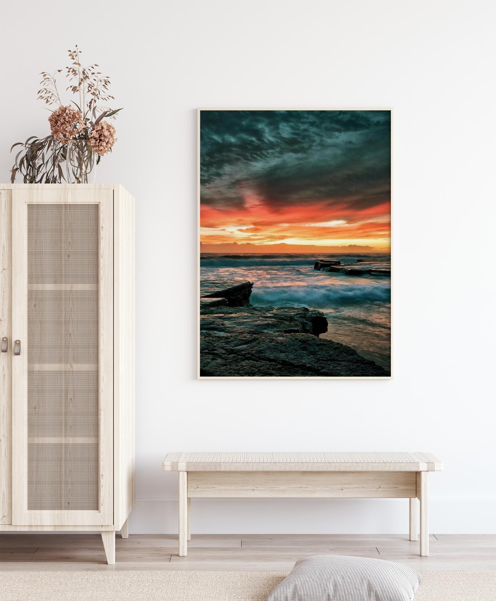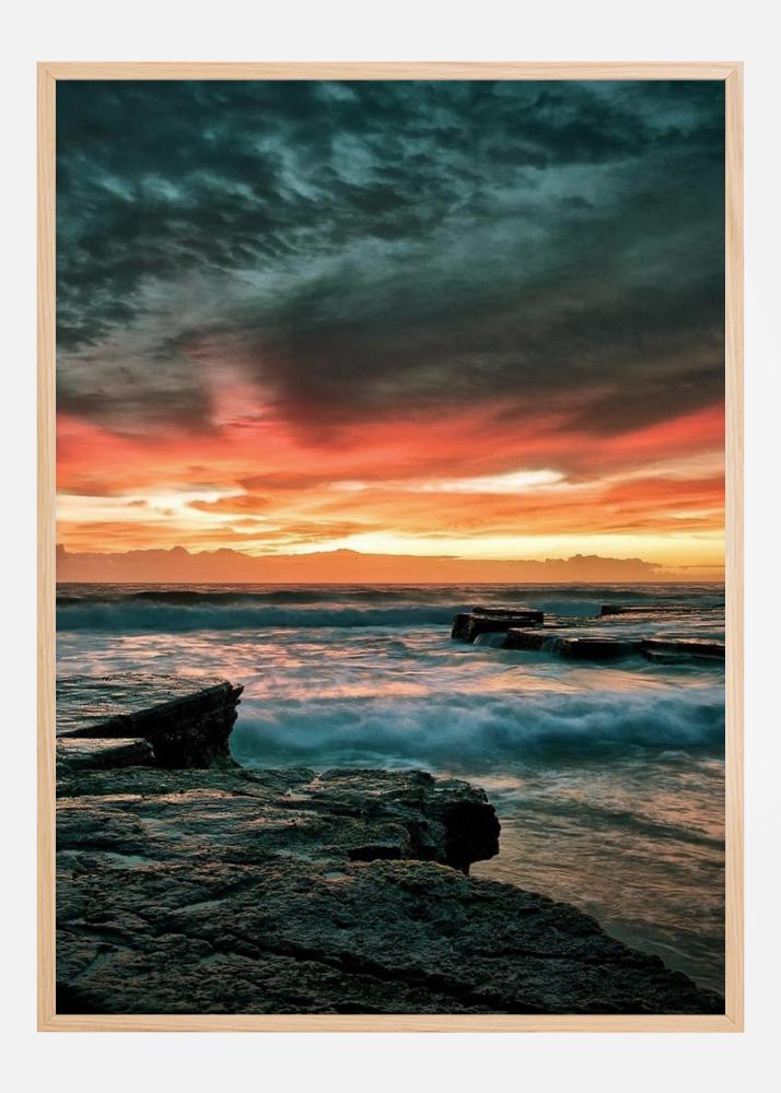 Epski plakat z zahodom sonca nad vodo. Valovi iz morja se razbijajo ob ravno kamnito obalo. Temni oblaki ležijo neposredno nad njimi z jasno rdečim zahodom sonca nizko na obzorju, kar ustvarja dramatično in impresivno sliko, ki bo pritegnila vašo pozornost.