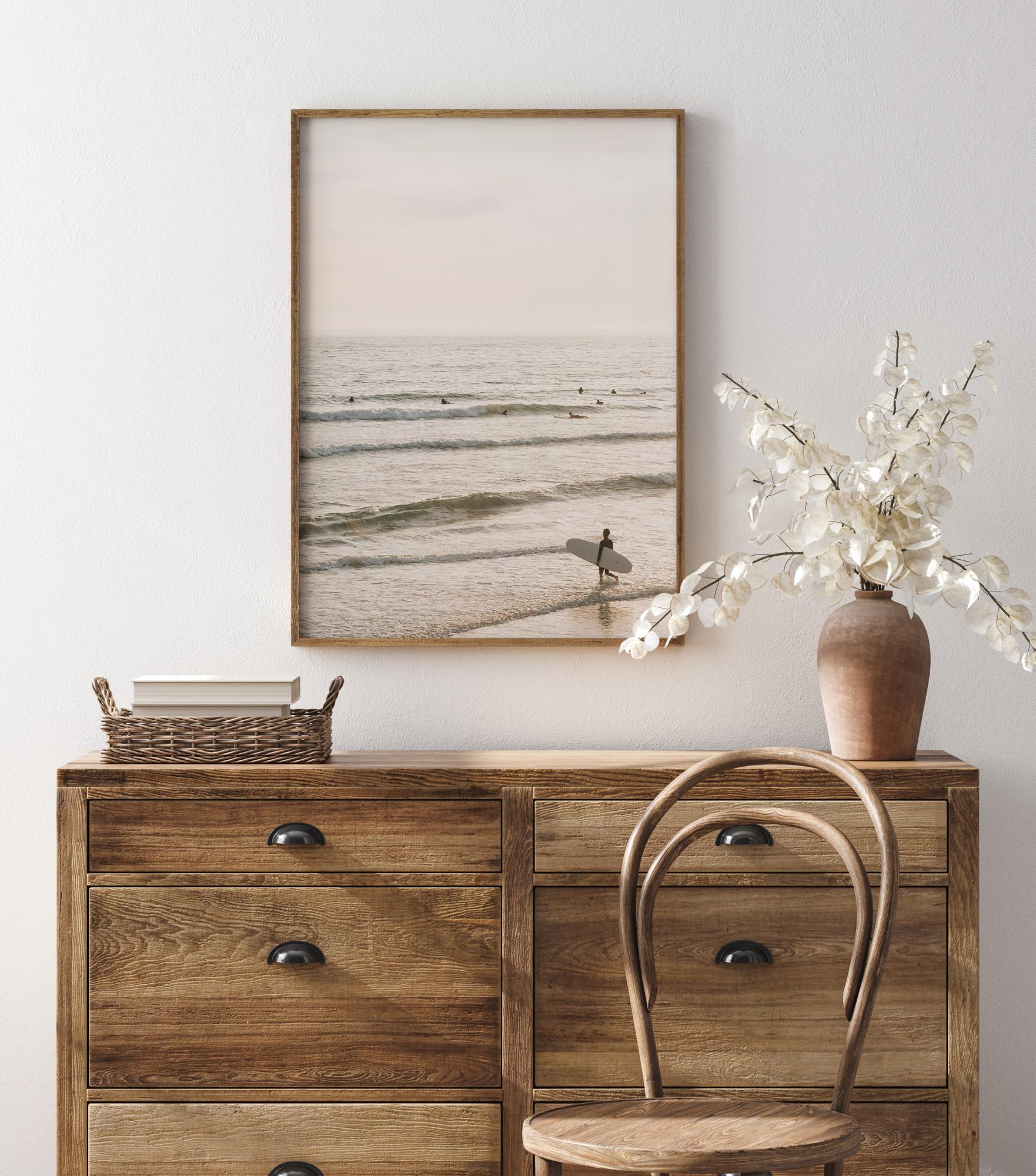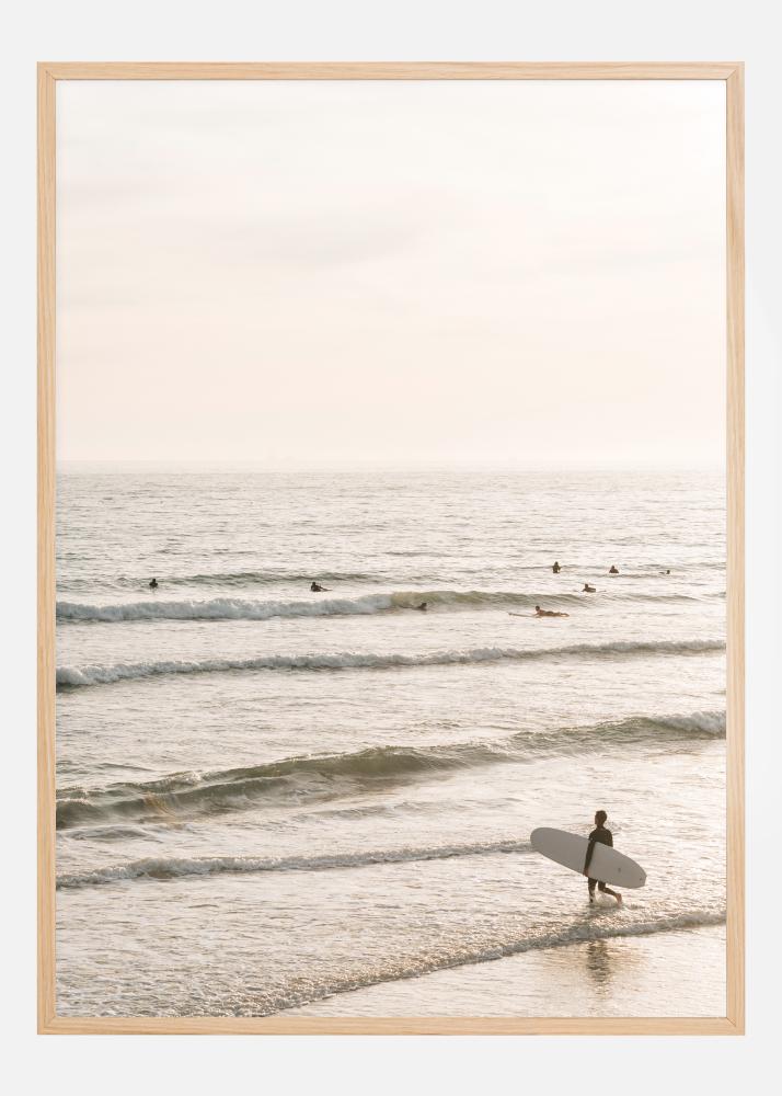 Plakat s prostranim morjem, polnim deskarjev, ki čakajo na naslednji veliki val. Majhne glave se gugajo daleč v morju in zadnji deskar se s svojo desko sprehaja med valovi. Morje je mirno v mehki jutranji svetlobi in v zraku je občutek pričakovanja.