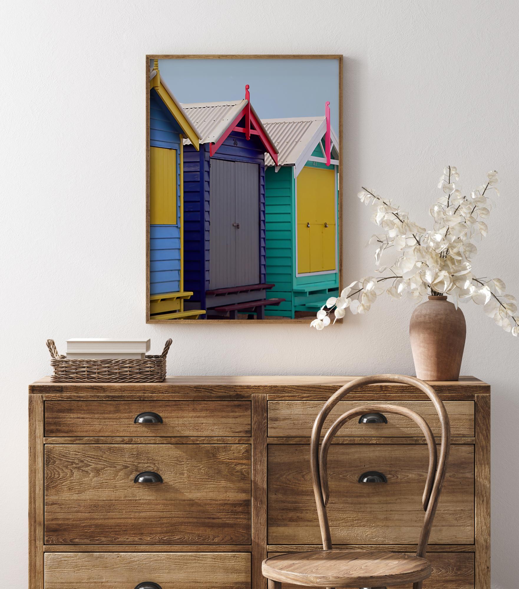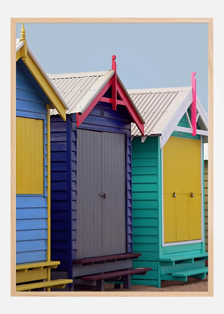 Plakat v svetlih barvah s pisanimi plažnimi kabinami. Vsaka koča je pobarvana v več živahnih barvah, kot so rumena, modra, roza in turkizna. Ujemite poletni plažni občutek, ko ga obesite na nevtralno steno in dodate barvo svojemu domu.