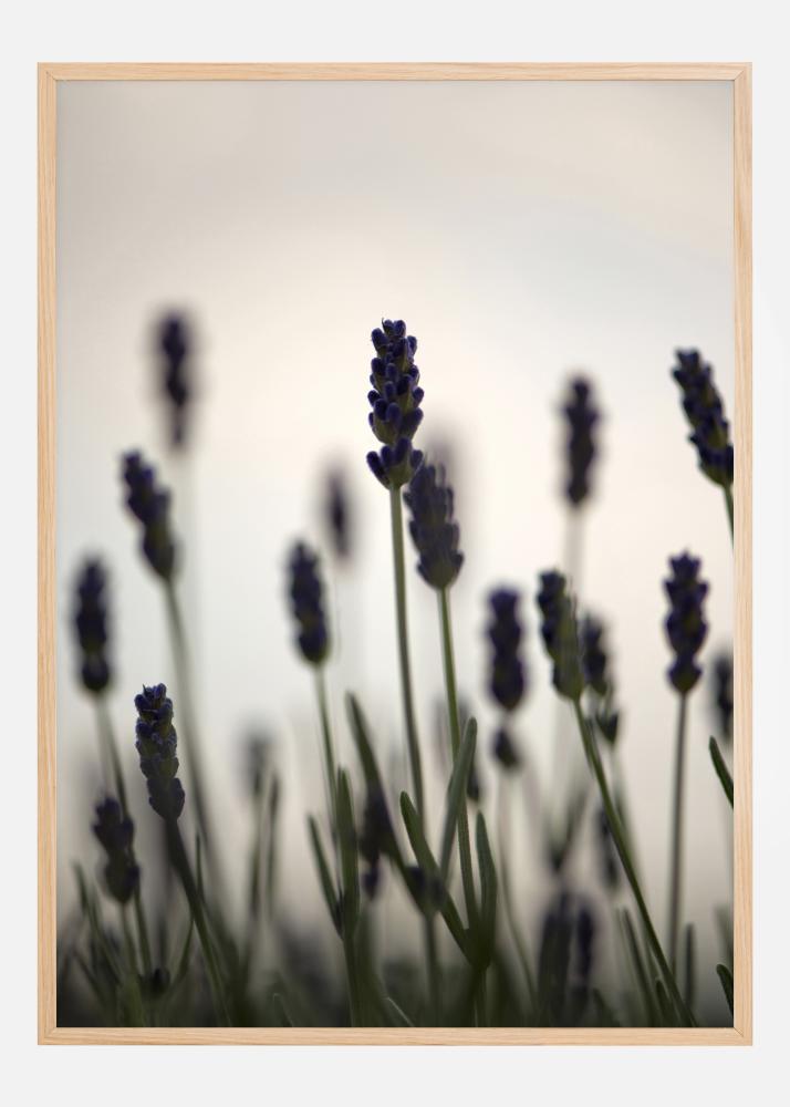 Cvetlični poster s posnetkom lavande od blizu na polju. Če pogledate natančno, lahko vidite vijolične popke, ki se pozibavajo na vrhovih zelenih stebel. Stojijo pokonci proti preprosti beli podlagi, ki je popoln dodatek za barvito sobo.