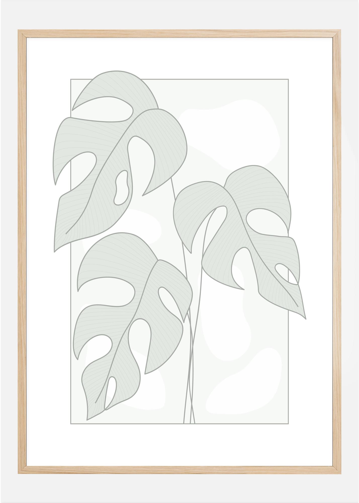 Preprost plakat z ilustrativnimi listi monstere. Tri velika lista zapolnjujejo sliko, vsak v mehkem sivem tonu. Tanjše črte predstavljajo stebla, ko ti elegantni listi z luknjami visijo navzdol v tej sliki. Ohrani diskretnost, tako da to obesiš na mehko zeleno steno za občutek narave.