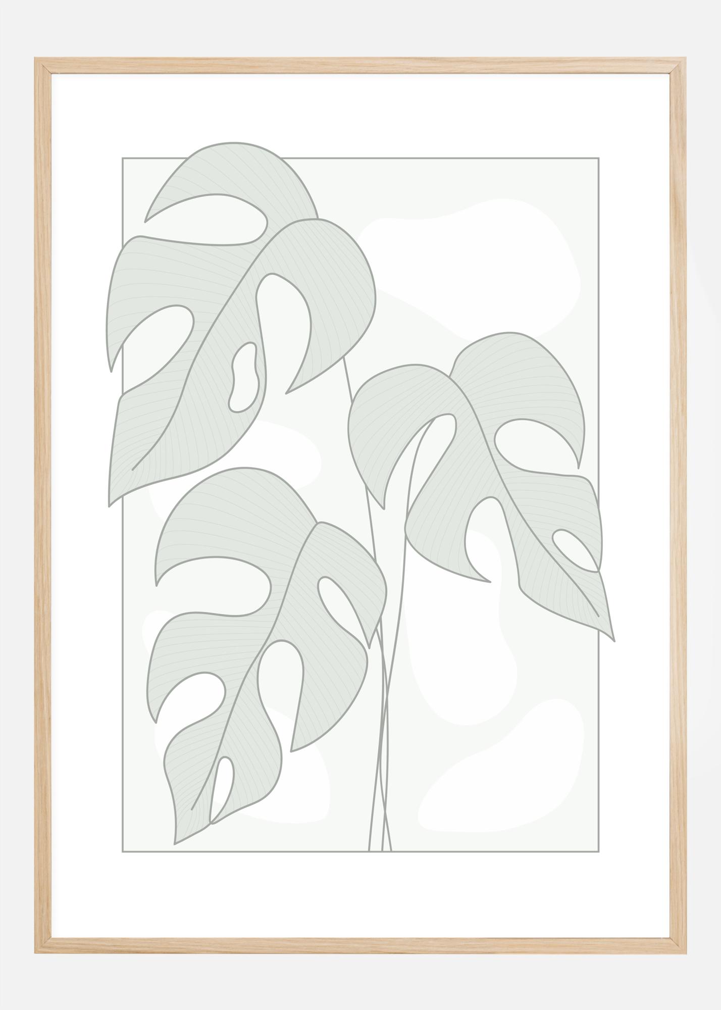 Preprost plakat z ilustrativnimi listi monstere. Tri velika lista zapolnjujejo sliko, vsak v mehkem sivem tonu. Tanjše linije predstavljajo stebla, ko ti elegantni listi z luknjami visijo navzdol na tej sliki. Ohranite diskretnost tako, da jo obesite na mehko zeleno steno za občutek narave.
