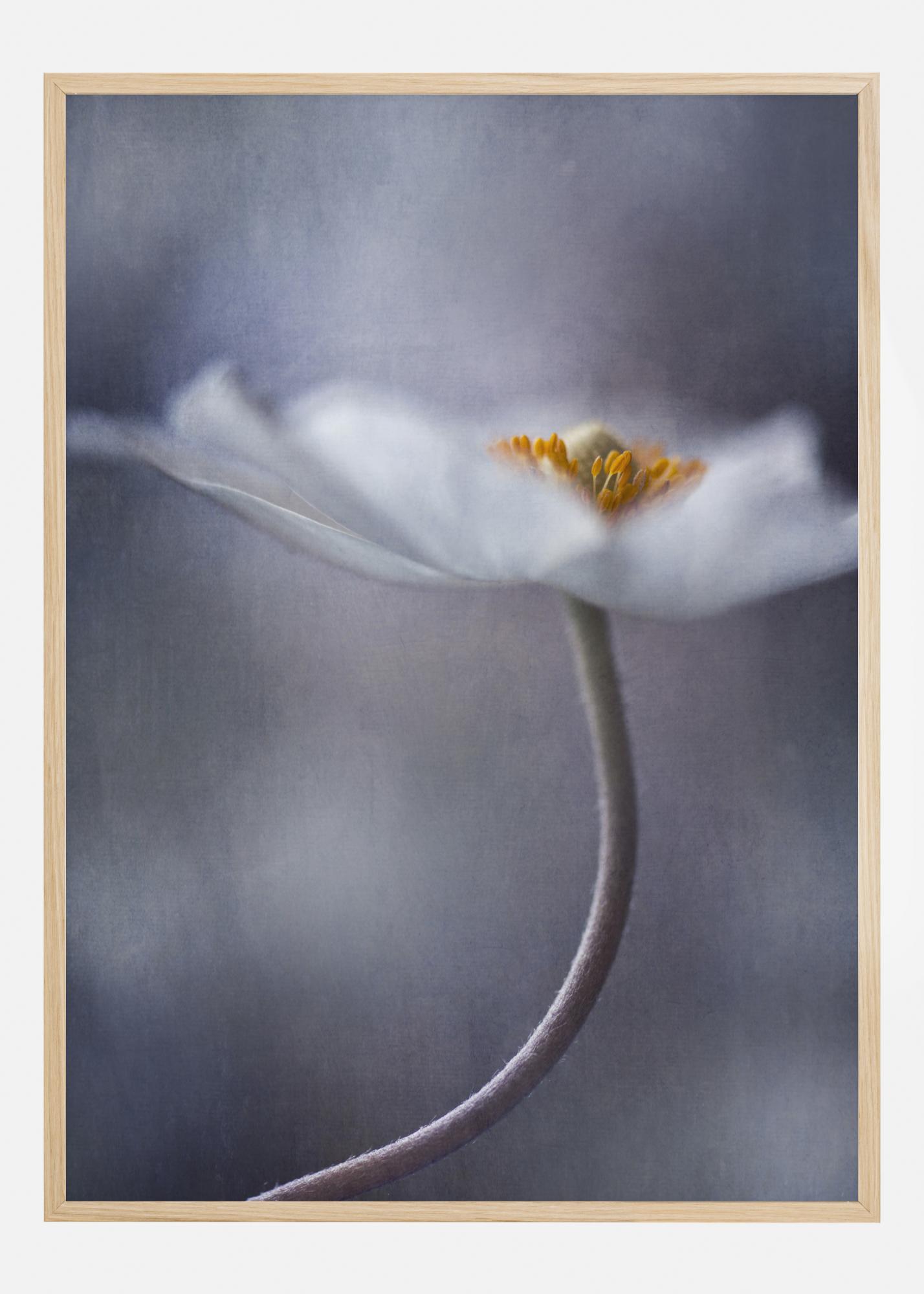 Cvetlični poster s približanim posnetkom bele rože na mehkem sivem ozadju. Oranžno središče rože izstopa proti utišani zeleni, kar ustvarja svetlo žariščno točko in poudarja lepoto rože ter zunanjosti. Je eterično in magično ter izžareva mir.