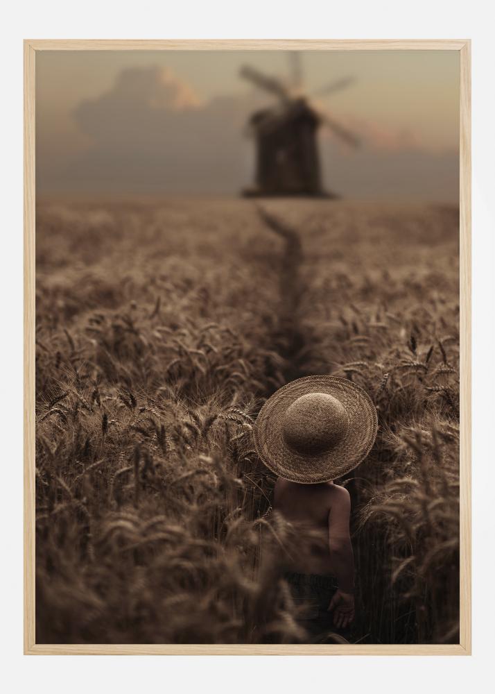 Portretni plakat dečka na polju pšenice z veternico v daljavi. Mehke rumene in roza barve ustvarjajo resnično mirno držo. Pojdite proti tisti veternici skupaj z dečkom s pomočjo te slike.