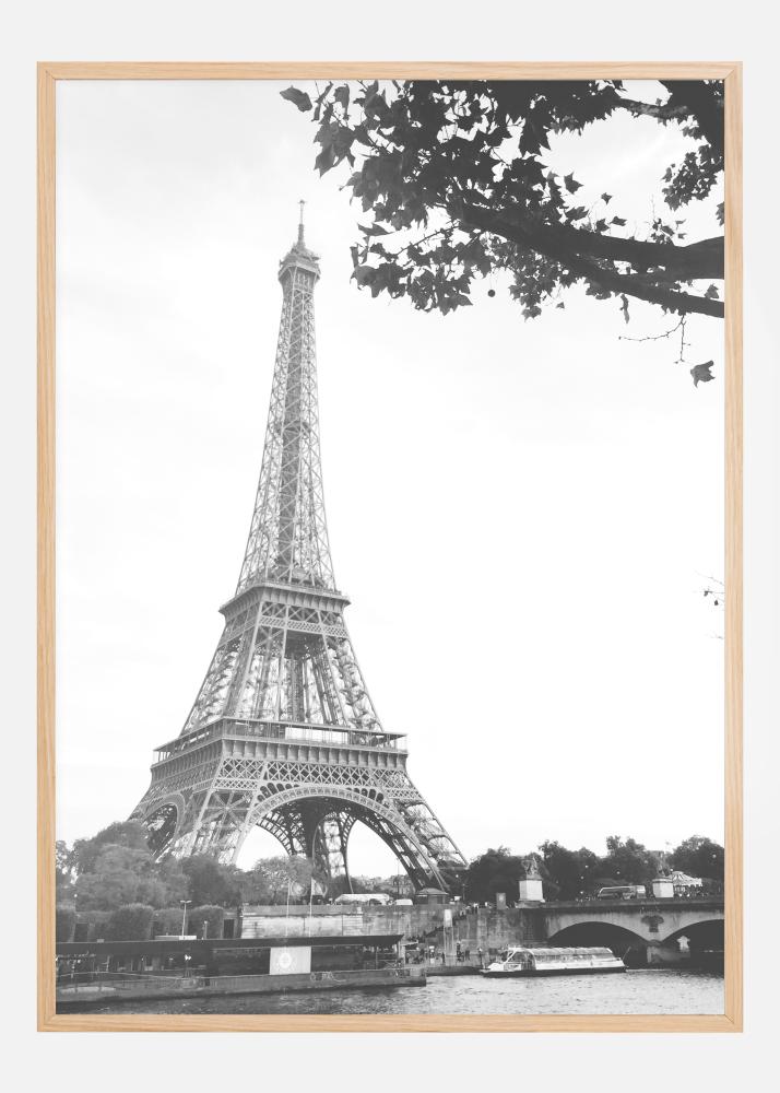 Mestni plakat z Eifflovim stolpom v Parizu. Siv stolp je jasno viden proti belemu nebu. Spodaj je vidno živahno življenje reke s čolnom in mostom. Skoraj vrh stolpa zakriva drevesna veja v tej preprosti, naravni podobi tega ikoničnega spomenika.