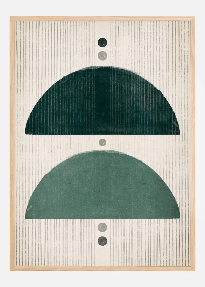 Ta plakat je več kot le dekorativna slika; je sodobna umetniška interpretacija, ki združuje naravno s stiliziranim. Tri krožne oblike, centrirane med polkrožnimi bloki, delujejo kot središče, ki povezuje celotno kompozicijo. Ta tisk bi lahko služil kot elegantna stenska funkcija v minimalističnem domu ali pisarni, pomirjujoči zeleni toni pa bi v katero koli okolje prinesli občutek narave in miru.