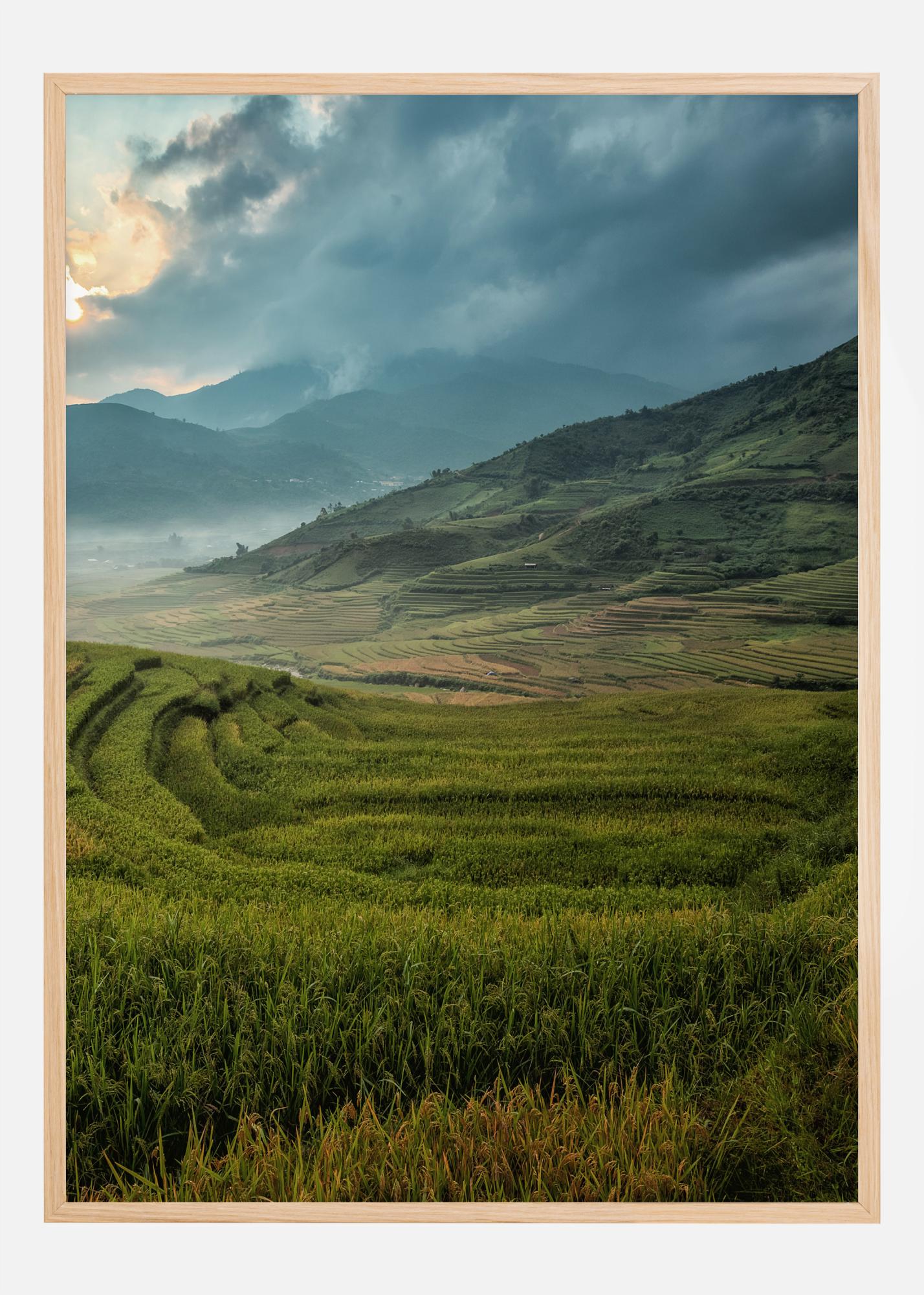 Čudovit plakat z motivom pokrajine z svetlo zelenimi griči in polji. Temni oblaki se valijo z desne strani in zakrivajo eno od oddaljenih gora. Vidna je oranžna črta sonca, ki ustvarja toplejši ton na tej epski sliki. Z občutkom prostornosti v vašem domu ta tisk ustvari edinstveno vzdušje.
