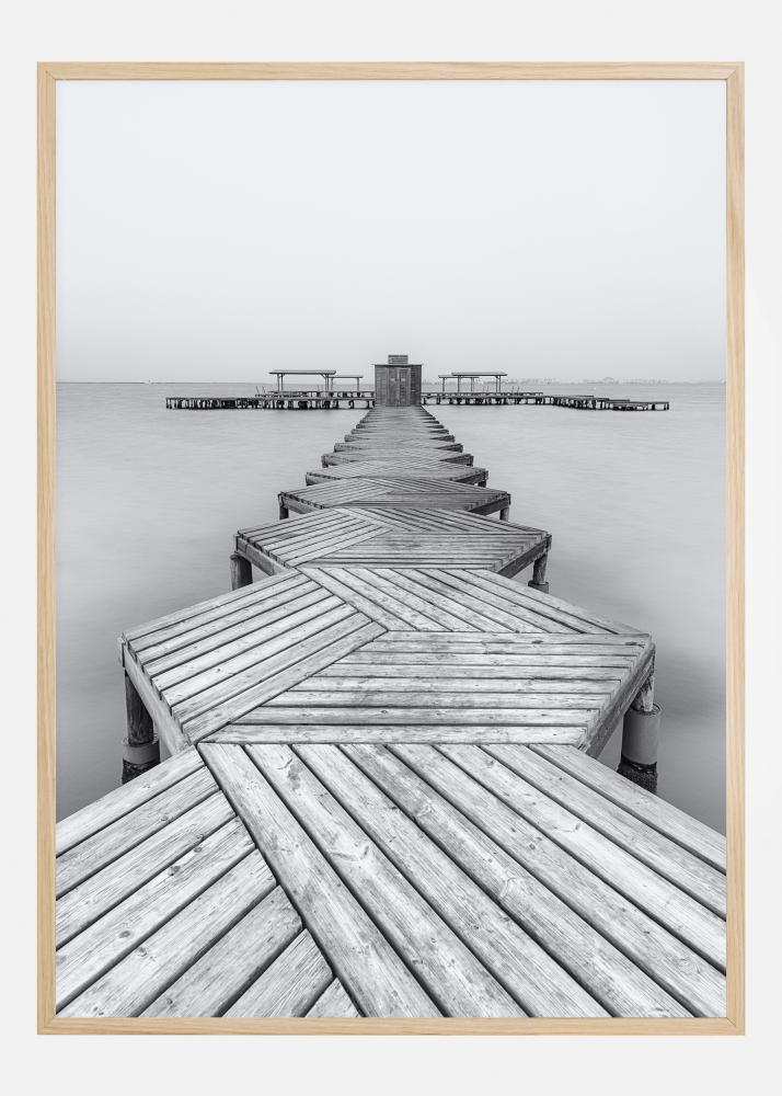Zabaven poster s šestkotnim pomolom, ki se premika proti daljavi po mirnem jezeru. Slika je v umirjenih sivinskih tonih, zaradi katerih deluje bolj hladno kot toplo. Leseni pomol vas vodi v daljavo, kjer vas čaka pomol. Združite s svetlo barvo, da dodate toplino.