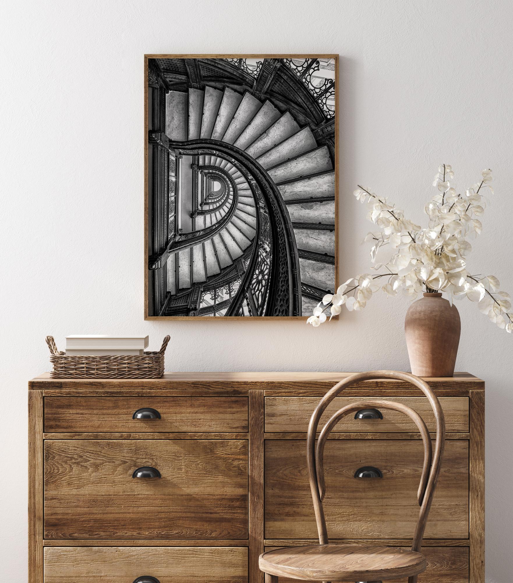 Notranji plakat s serijo spiralnih stopnic, ki se vijejo navzdol do dna stavbe. Pogled od zgoraj kaže stopnice okoli sebe. Ograje iz kovanega železa so podrobne in izstopajo proti preprostim stopnicam. Kontrastne tone dajejo delu globino, ko pogled privablja vse do dna.