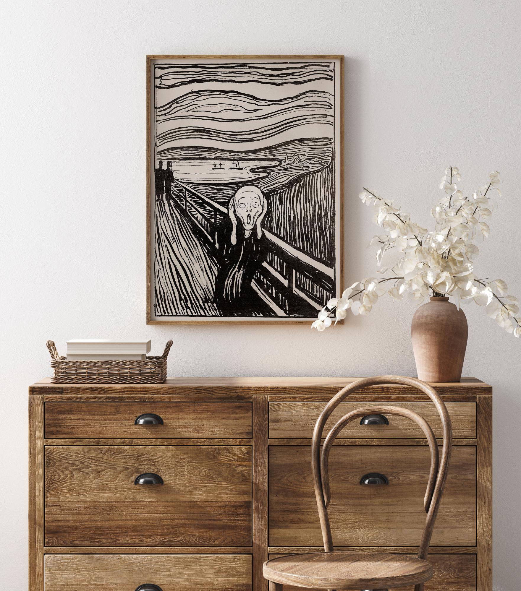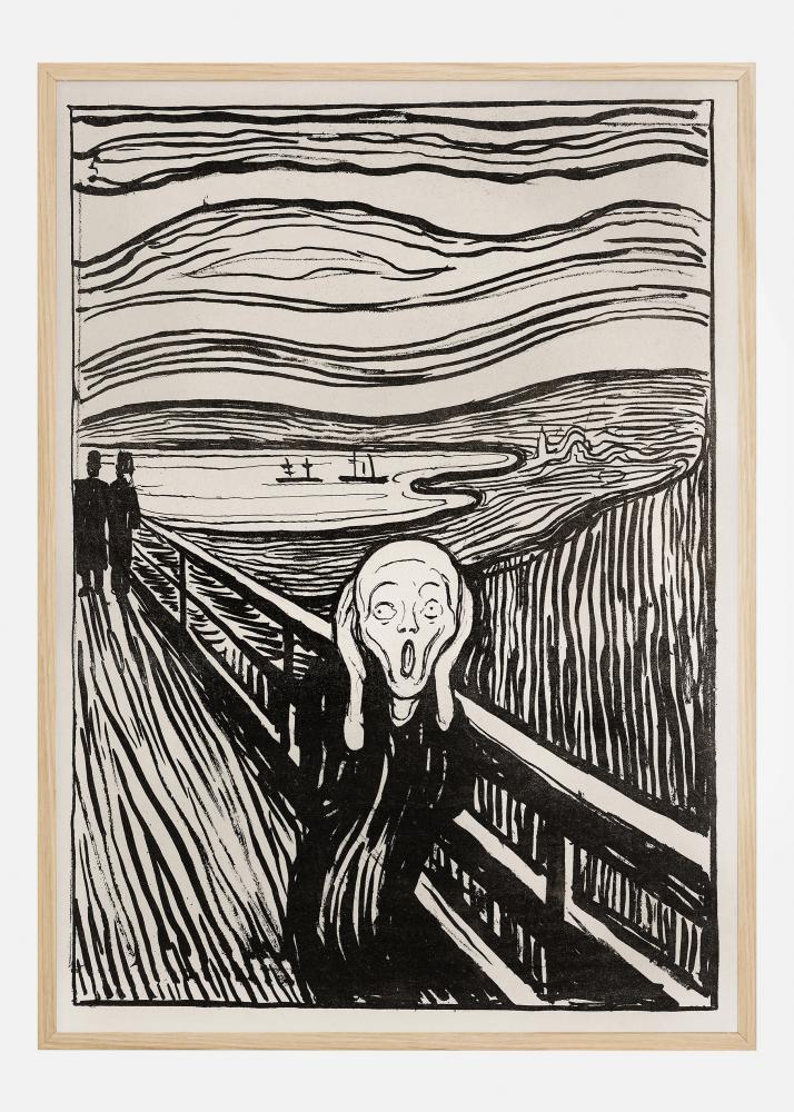 Abstraktni ekspresionistični plakat Edvarda Muncha z naslovom Krik v črno-beli različici. To je ikoničen črno-beli tisk, ki ga vsi takoj prepoznajo, osredotočen na bel obraz kričeče osebe na mostu. Pokažite svoje poznavanje umetnosti s to klasično sliko na barviti steni doma.