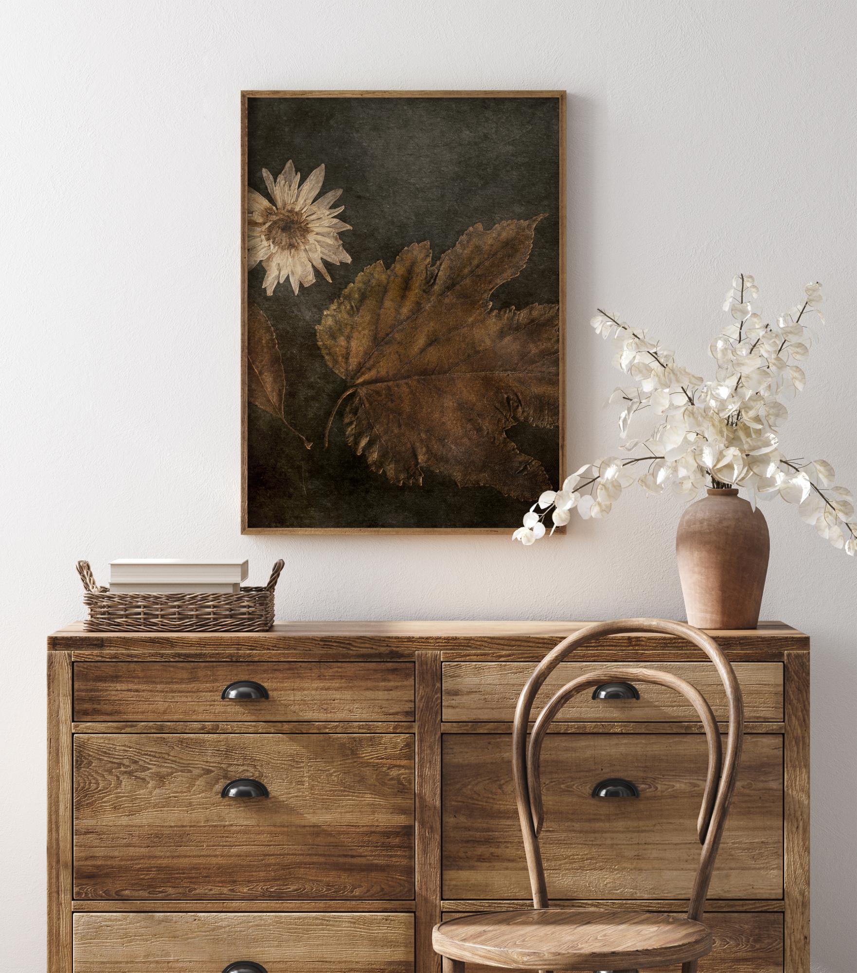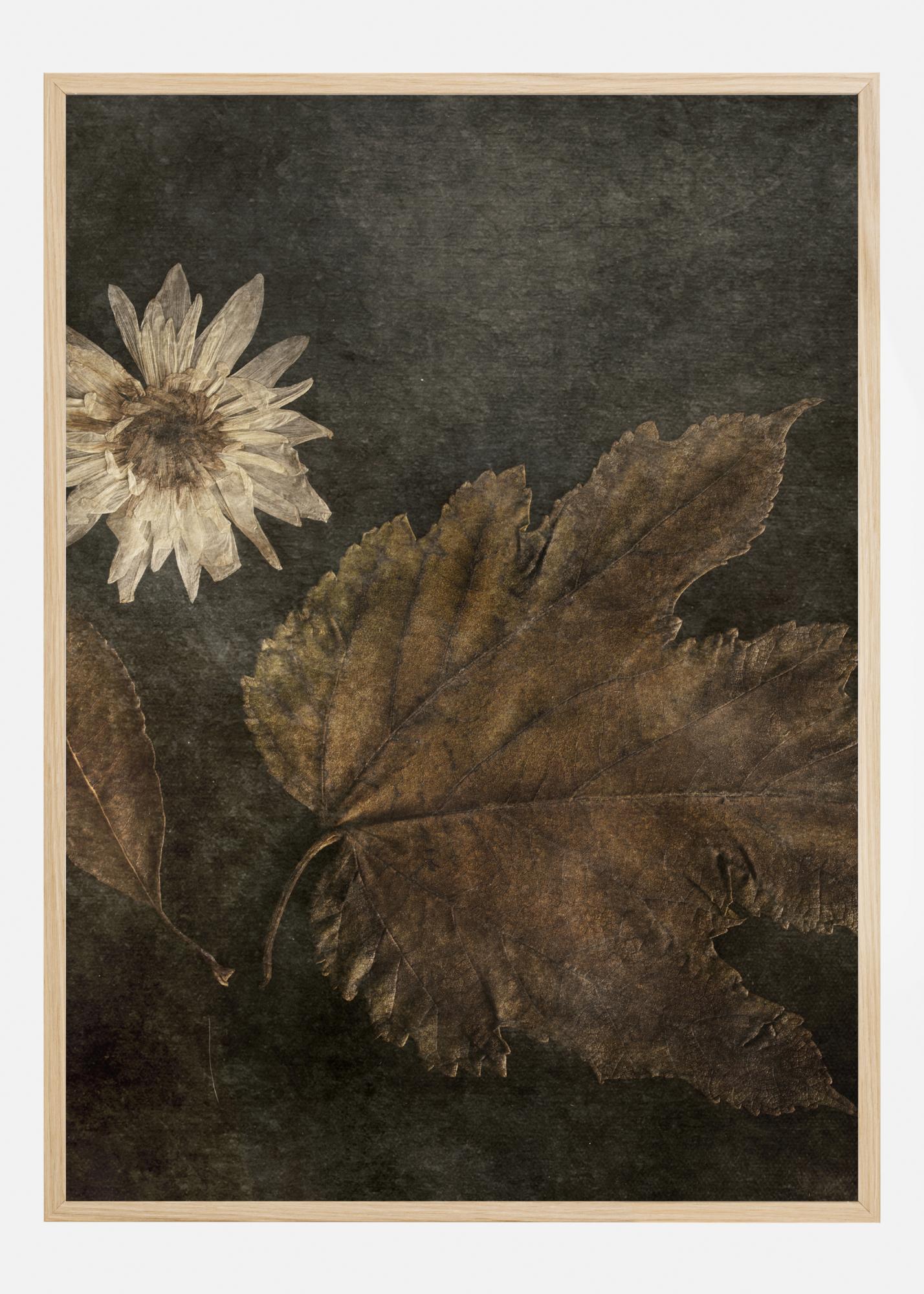 Poster z rožo z enostavnim cvetom z dvema listoma. Bela cvetica v obliki zvezde pritegne pogled, kjer izstopa na temno sivi podlagi. Dva rjava jesenska lista jo obkrožata, eden enostavno ovalen in drugi bolj zapleten, figov list. Skrbno si oglejte podrobnosti listov in cvetnih listov v tem čudovitem botaničnem tisku.