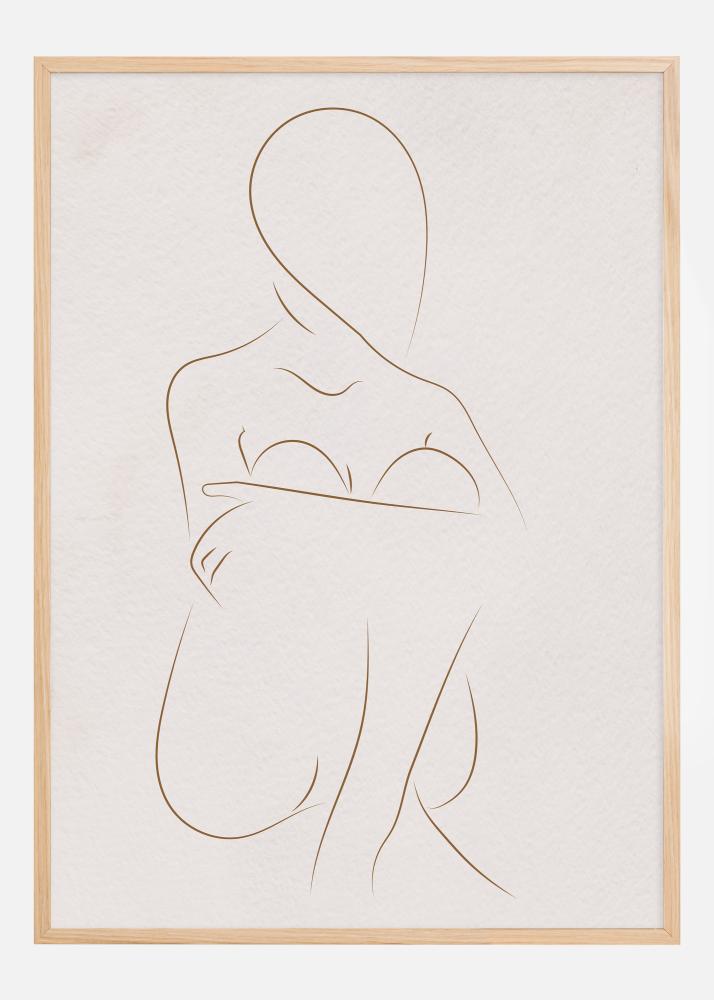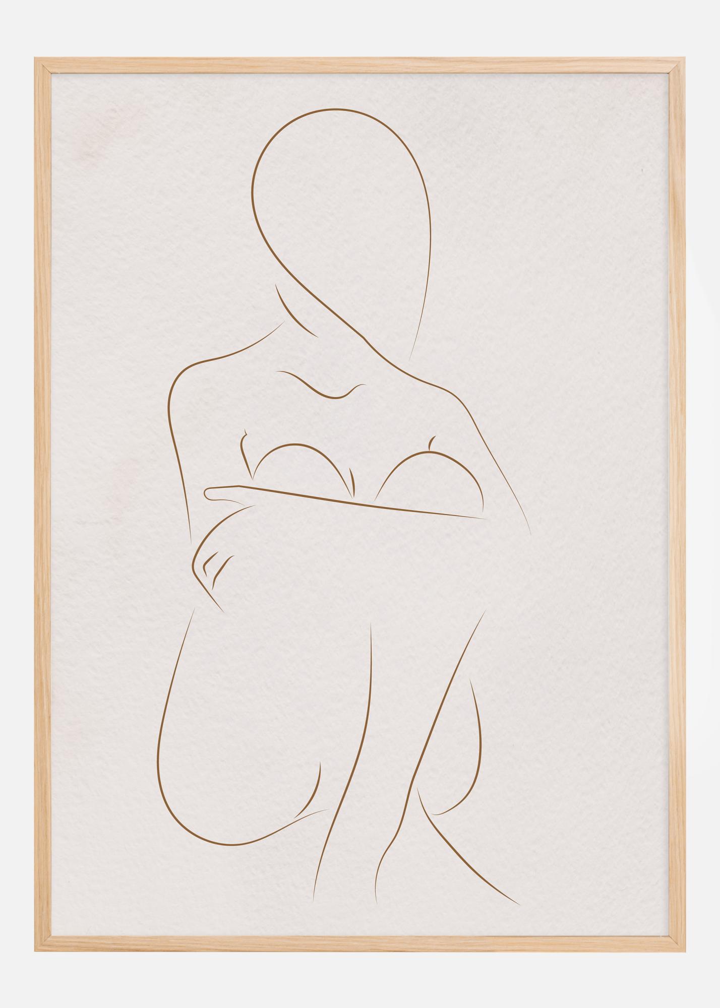 Ta eleganten in minimalističen plakat prikazuje žensko figuro, ustvarjeno s tankimi linijami, ki ujame v svoji preprostosti. Linearna umetnost uporablja subtilno in prečiščeno estetiko za upodobitev ženskega telesa, kar daje prostor za gledalčevo lastno interpretacijo in domišljijo. Mehke konture in prečiščen izraz ustvarjajo moderen in eleganten vtis, ki se dobro ujema z minimalističnim ali skandinavskim oblikovanjem.