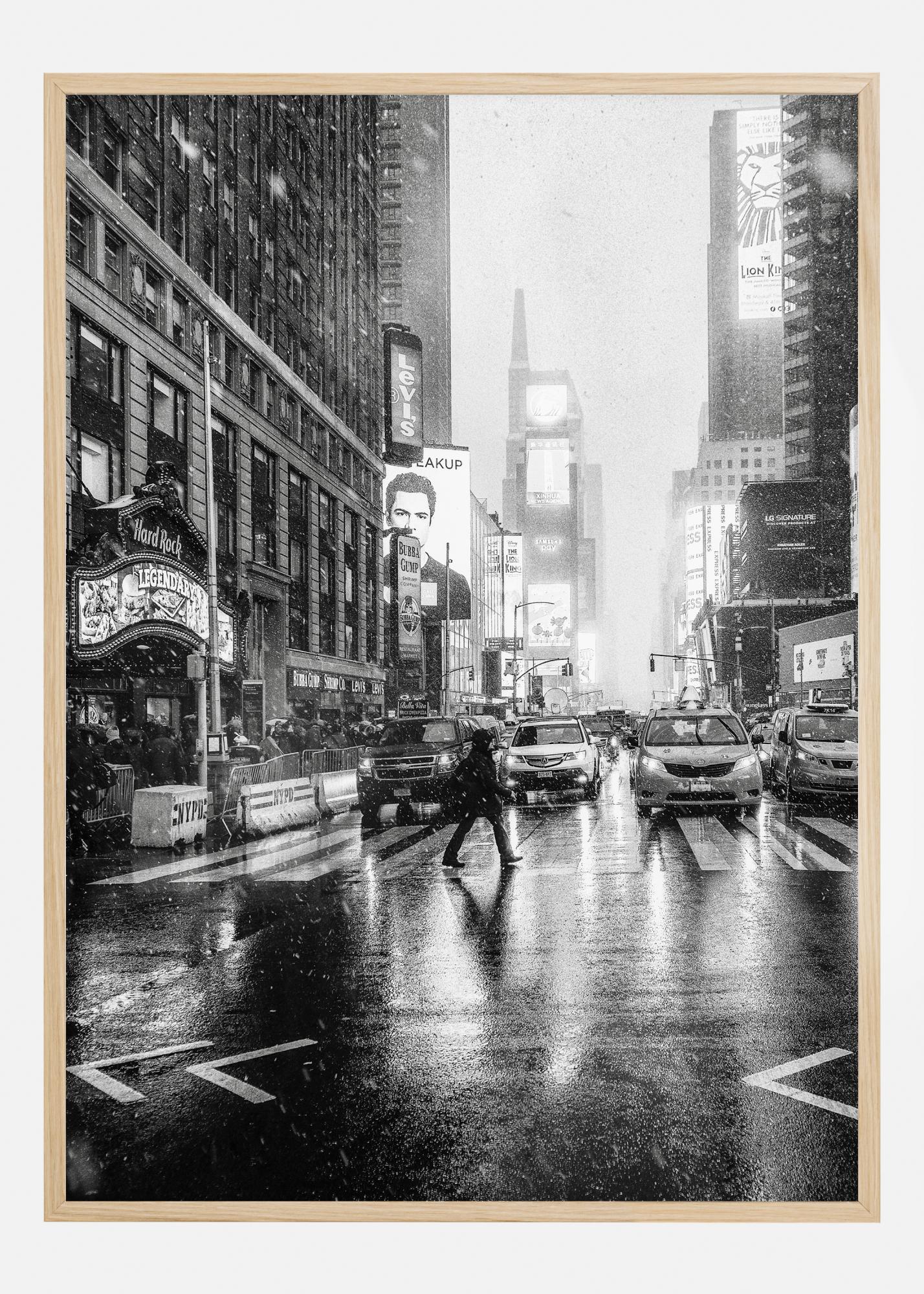 Mestni plakat s Times Square v New Yorku. Na tej črno-beli sliki oseba ponoči prečka cesto v dežju. Avtomobili čakajo, da se lahko premaknejo naprej. Svetle reklamne table in nebotičniki so vidni v daljavi, ko pogledate po ulici navzdol. Atmosfera je otipljiva, skoraj bi lahko bili tam sami.